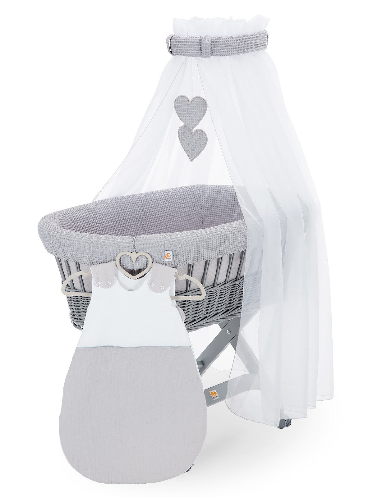Das Herzstück bildet der grau lackierte Weidenkorb, der in Kombination mit dem stabilen Untergestell aus massiver Buche eine harmonische, zeitlose Optik bietet. Eine integrierte Himmelstange rundet das Gesamtbild stilvoll ab.