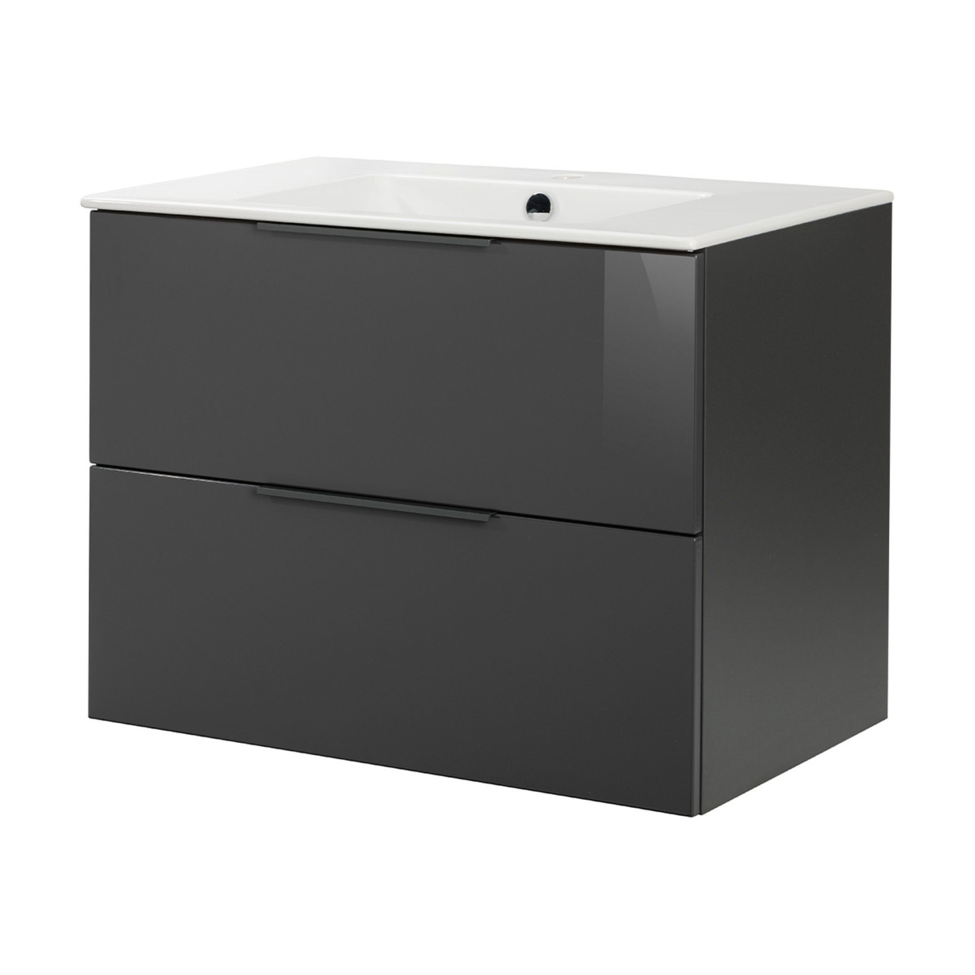 » 1. WaschbeckenMaße (B x H x T): ca. 81 x 16,5 x 51 cm, Material: Keramik, Farbe: Weiß, Hahnloch: mittig, mit integriertem Überlauf» 2. WaschtischunterschrankMaße (B x H x T): ca. 80 x 61 x 49 cm, 2 Schubladen mit Soft-Close-System, Querteile und Rückwand silbergrau, Korpus und Front: Schwarz/Anthrazit matt, Soft-Close