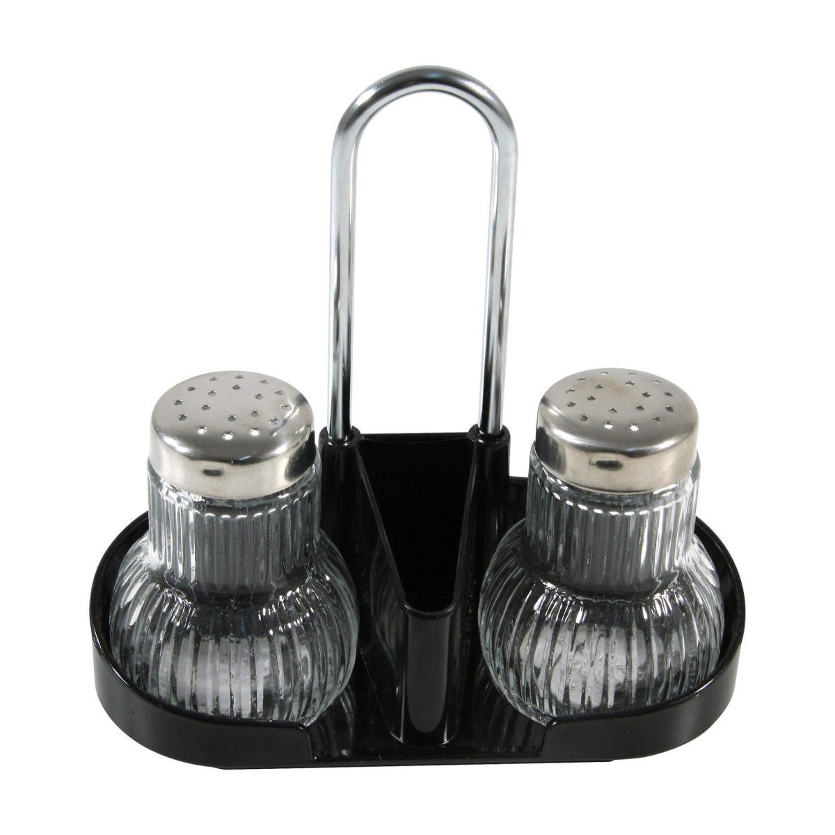Die Kombination von formschönem Design und praktischem Nutzen sind die Hauptmerkmale der Salz-/Pfeffermenage von Fackelmann. Diese Menage für Salz und Pfeffer umfasst zwei Glasbehälter mit Streukappen aus rostfreiem Edelstahl, die in der Spülmaschine gereinigt werden können. Das circa 13 cm breite Menagengestell ist mit einem Griffbügel sowie einem kleinen Behälter, der bei Bedarf mit Zahnstochern gefüllt werden kann, ausgestattet.
