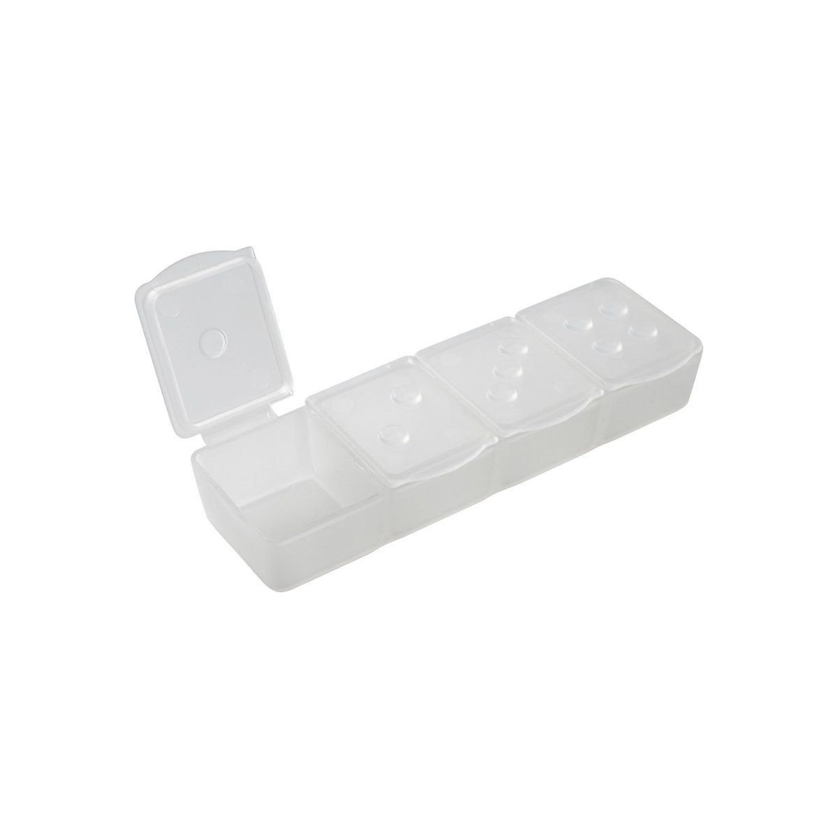 Mit der Tabletten-Box von Fackelmann haben Sie Ihre Tabletteneinnahme im Griff. Die Box verfügt über vier Fächer mit Tastmerkmalen und kann bei Bedarf in der Spülmaschine gereinigt werden. Die Tabletten-Box überzeugt durch Ihre Qualität, da sie in Deutschland hergestellt wird.