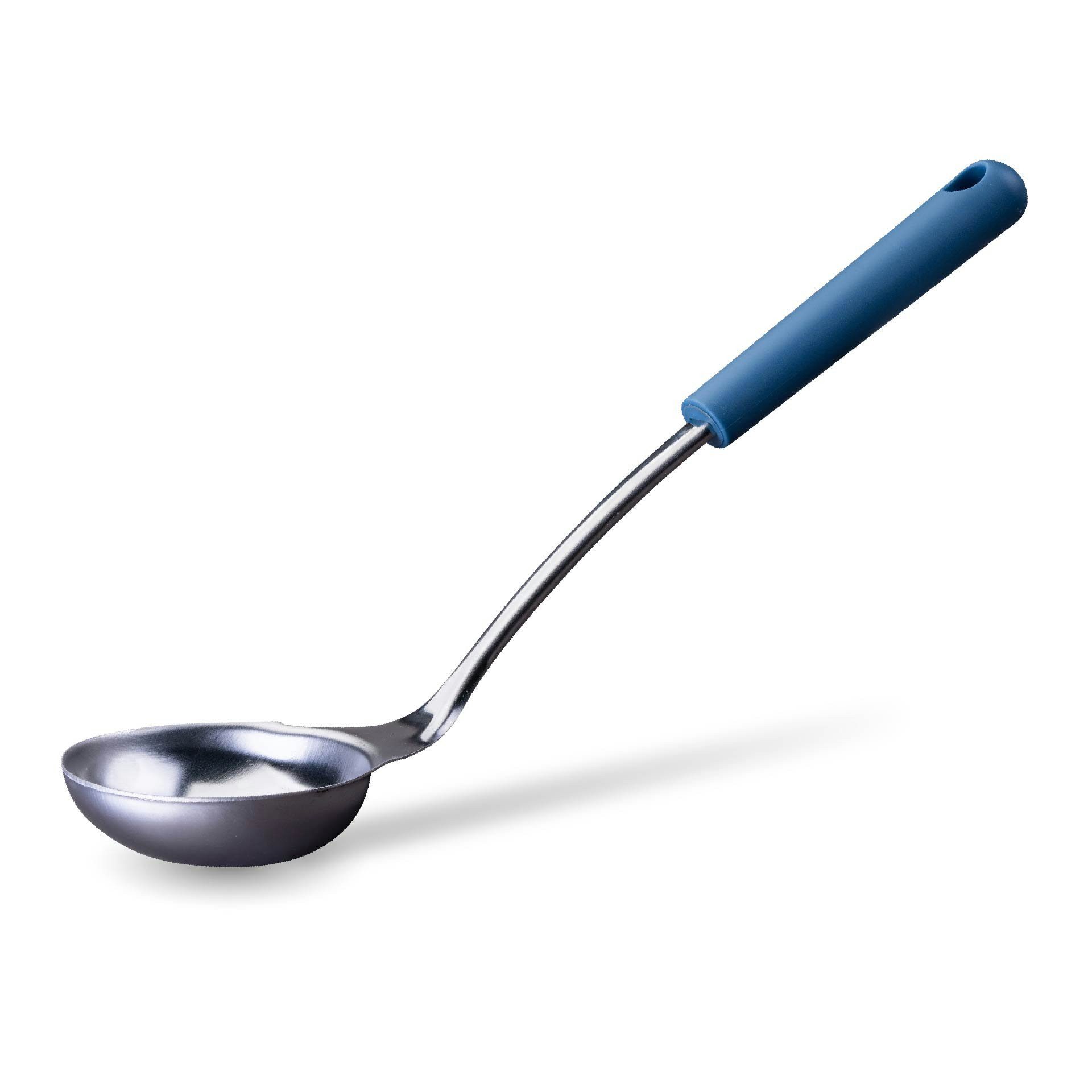 Der ergonomisch geformte Griff aus dunkelblauem PP-Material sorgt für eine angenehme Handhabung, auch wenn es in der Küche einmal heiß hergeht. Dank der integrierten Aufhängeöse kannst du den Löffel einfach aufbewahren und hast ihn immer schnell zur Hand, wenn er gebraucht wird.
