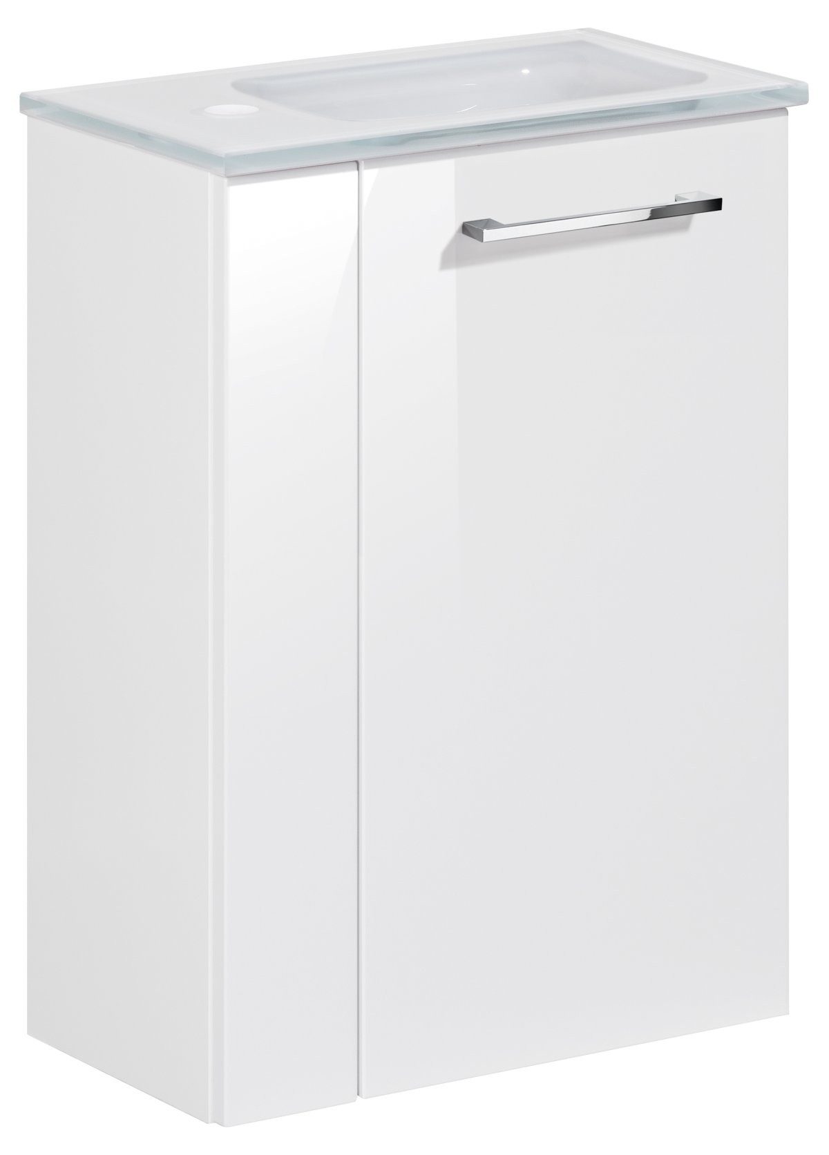 Der Mini-Waschtischunterschrank hat eine Breite von 450 mm und bietet trotz seiner kompakten Размер ausreichend Stauraum für Ihre Badezimmerutensilien. Das Becken aus Glas ergänzt den Unterschrank perfekt und verleiht Ihrem Bad ein modernes sowie zeitloses Aussehen. Die Fronten des Unterschranks sind ebenfalls in Weiß gehalten, was die harmonische Optik unterstreicht.