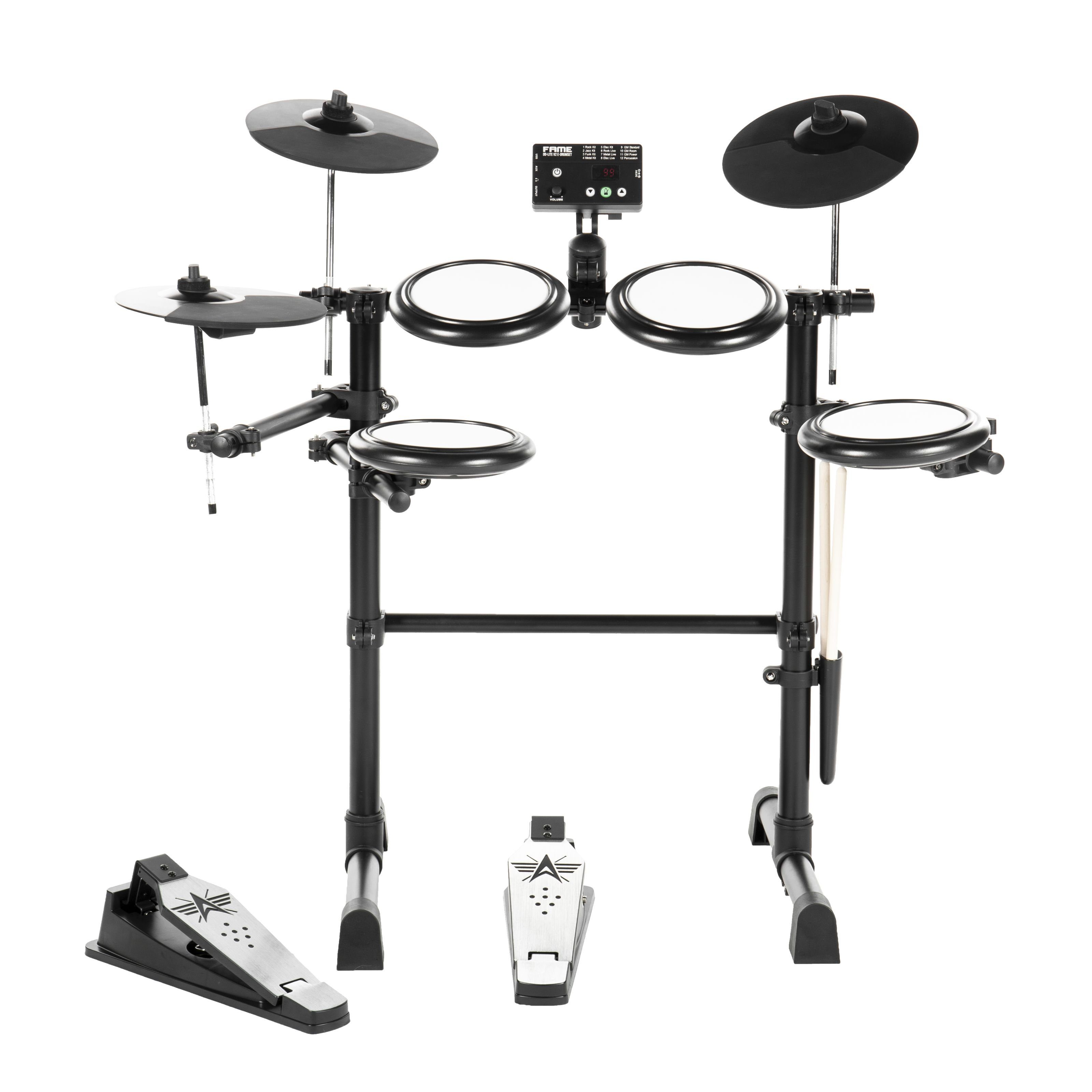 Lieferumfang | EINSTEIGER ELEKTRO-SCHLAGZEUG: Unser Elektronisches Schlagzeug-Set ist ein E-Drum Set mit Mesh-Pads und Stick Holder. 144 Schlagzeug-Sounds aus allen Stilrichtungen. Die Pads und das Drum Rack bieten tolles Spielgefühl und geringe Lautstärke. LAUTLOS SCHLAGZEUG ÜBEN MIT E-DRUM: E-Drums im praktischen Format mit Snare, drei Tom Pads, zwei Cymbal Pads , einem HiHat Pad plus Fußregler und einem Bass Drum Controller. Das E-Drum Kit ist perfekt für Anfänger. Die Pads sind robust, die Snare hat zwei Zonen. Lautloses E-Drum mit tollem Spielgefühl!. LEISTUNGSSTARKES SOUNDMODUL: 144 Schlagzeugsounds für alle Stilrichtungen. E-Schlagzeug mit Display, 12 Drumkits, Metronom, USB, Master Out, MIDI, Kopfhöreranschluss und Aux-Eingang. LAUTLOS SCHLAGZEUGSPIELEN: Digital Drums mit lautlosen Mesh-Pads. So kann man bequem und ohne Zeitlimit Schlagzeug Spielen ohne die Nachbarn zu stören, indem ein Kopfhörer angeschlossen wird. Das Snare-Pad hat zwei Zonen, kann also doppelt mit Sounds belegt werden. ALLES MIT DABEI: Neben den Pads sind alle Kabel, das DD-Lite Modul, Hardware und Rack mit integriertem Stickhalter sowie Drumsticks enthalten. Somit steht dem lautlosen Musizieren zu jeder Tageszeit nichts mehr im Wege. MS-ID: DRU0038935-000 Hersteller: Fame samplefähig: Nein interner Sequenzer: Nein Pads: Mesh Padart: Mono Anzahl Trigger-Eingänge: 9 Midi Schnittstelle: Ja USB Speicher: Nein Mix Input: Ja Padgröße: 6" Triggerart: Universal Anzahl Drumkits: 12 Anzahl Sounds: 144 Recording Funktion: Nein Kompressor: Nein interne Effekte: Nein Anzahl Fader: 0 Anzahl Percussion Sounds: 0 Master Out: Ja Anzahl Preset Patterns: 0 Anzahl Direct Out: 0 Anzahl User Patterns: 0 Digital Output: Ja Display: Ja Kopfhöreranschluss: Ja USB Memory Song Player: Nein Inkl. Fußmaschine: Nein integriertes Metronom: Ja Размер Snare: 6" Foot Switch Anschluss: Nein Размер Tom 1: 6" Размер Tom 2: 6" Размер Tom 3: 6" EQ: Nein Inkl. Snare Ständer: Nein Interner Speicherplatz: 0 Echte HiHat: Nein Anzahl freier Padeingänge: 0 |