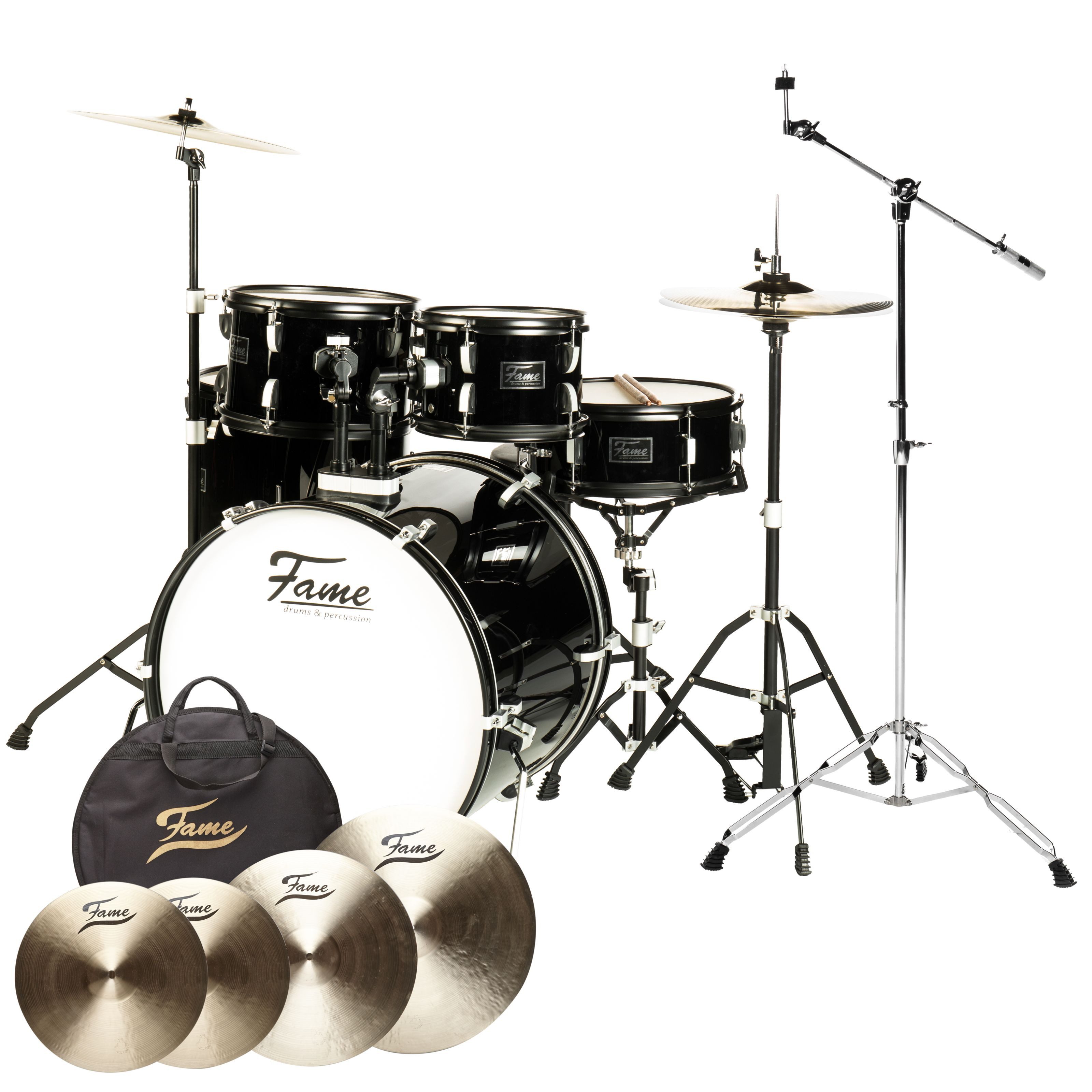 Set bestehend aus: 1 x Fame FS22B First Step Rock Set Black - Drum-Set 1 x Fame Masters B20 Cymbal Set I, Traditional Finish - Becken Set 1 x Fame Galgenbeckenständer CBS4000 - Beckenständer 1 x Fame Table Top TTY Practice Pad Yellow 10" - Zubehör für Drums 1 x MUSIC STORE Drummer Handtuch Black 50th Anniversary - Zubehör für Drums