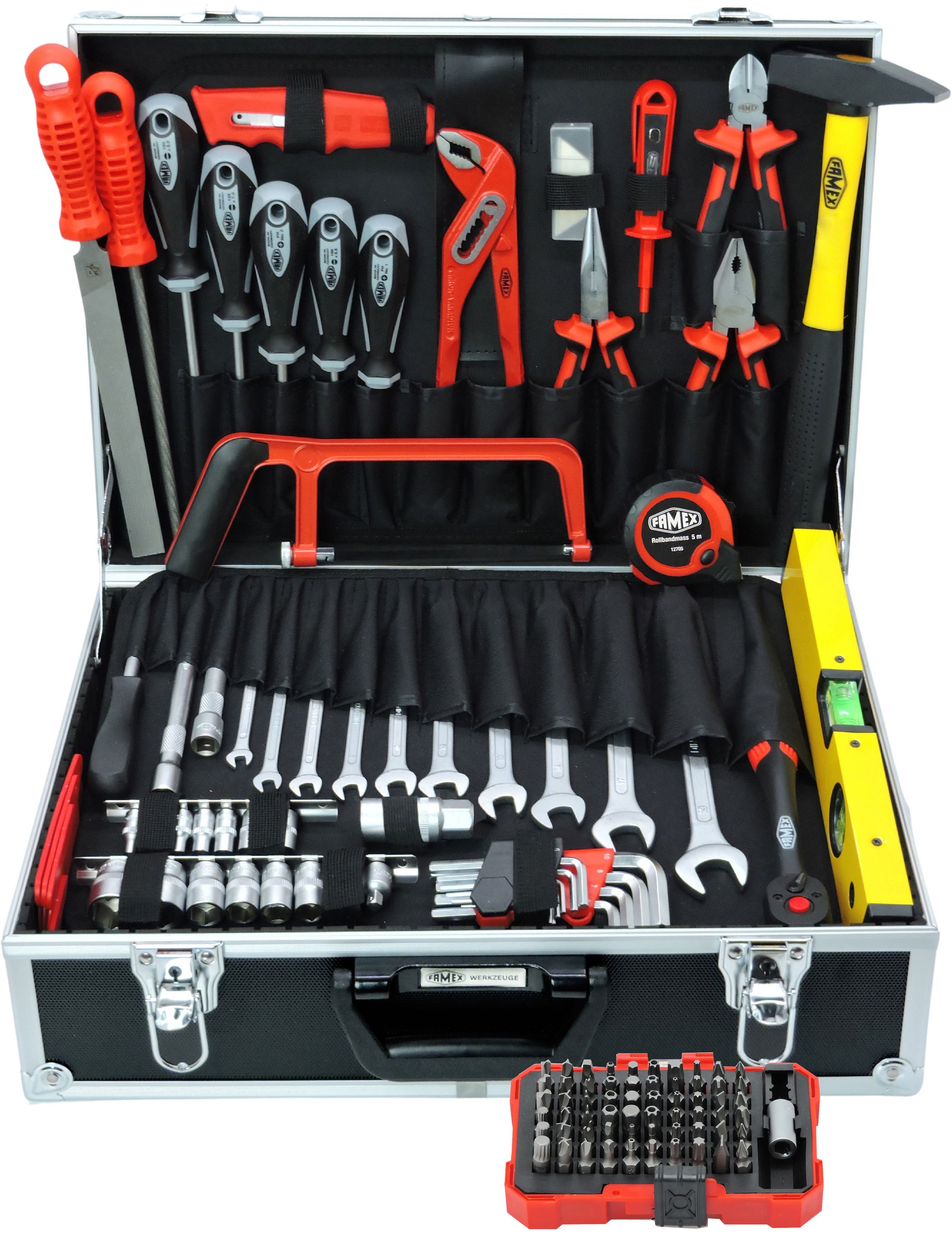 Der 164-teilige FAMEX Universal-Werkzeugkoffer 745-48 ist bestückt mit einem durchdachten Werkzeug-Set aus hochwertigem Chrom-Vanadium-Stahl. Entdecken Sie eine Vielzahl hochwertiger und robuster Handwerkzeuge. Ob für die eigene Wohnung, Garage oder Werkstatt - dieser Werkzeugkoffer ist ein Muss für jeden anspruchsvollen Anwender. Der Werkzeugkoffer verfügt über zwei Paletten und eine Facheinteilung im Kofferboden, die individuell bestückt und mit weiteren Werkzeugen oder Teilen ergänzt werden können. Anders als bei herkömmlichen Werkzeugkoffern ist die Anordnung des Werkzeugs nicht festgelegt.