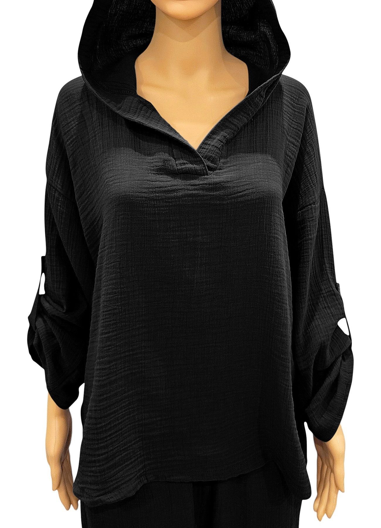 Erleben Sie den Sommer in stilvollem Komfort mit unserem lässigen Musselin Kapuzen-Shirt für Damen. Dieses Oberteil aus 100% atmungsaktiver Baumwolle vereint Leichtigkeit und Eleganz in einem. Der hochwertige Musselin-Stoff sorgt für ein angenehm weiches Tragegefühl und ist gleichzeitig atmungsaktiv, was ihn ideal für warme Tage macht. Die lockere Passform bietet Bewegungsfreiheit und sorgt dafür, dass Sie sich rundum wohlfühlen, egal ob am Strand, beim Stadtbummel oder zu Hause. Die integrierte Kapuze verleiht dem Shirt eine moderne, legere Note und schützt vor leichtem Wind und Sonne. Der V-Ausschnitt und die krempelbaren Langärmel mit Knopfdetails machen das Shirt vielseitig und wandelbar, sodass es sowohl casual als auch etwas schicker kombiniert werden kann. Ein besonderes Highlight sind die strukturierten Details des Musselin-Stoffes, die dem Shirt eine einzigartige Optik und Haptik verleihen. Die Ärmel lassen sich lässig hochkrempeln, ideal für einen entspannten Look. Das Kapuzen-Shirt ist in fünf modischen Farben erhältlich: Beige, Schwarz, Anthrazit, Weiß und Grün. Durch die großzügige Größenauswahl – Размер 1 deckt XS bis M ab und Размер 2 passt für L bis XXL – findet jede Frau die perfekte Passform. Das Shirt ist ein unkompliziertes Schlupfmodell ohne Verschluss, das einfach übergezogen werden kann, und ist somit ein echter Allrounder für den Alltag. Dieses Oberteil lässt sich nicht nur leicht kombinieren, sondern ist auch besonders pflegeleicht: Es ist maschinenwaschbar bei 30°C und bleibt auch nach häufigem Waschen in Form. Seine lockere Passform und die weiche, atmungsaktive Baumwolle machen es zum idealen Begleiter für jeden Sommertag. Setzen Sie auf Komfort und Stil mit unserem Musselin Kapuzen-Shirt – ein unverzichtbares Basic in jeder Sommergarderobe.