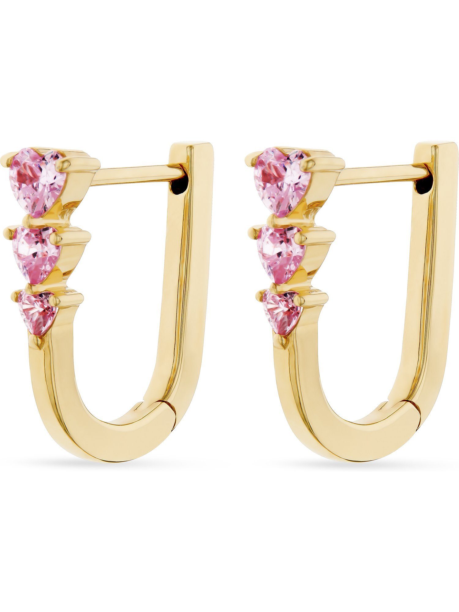 Sparkle and shine! Die Creolen in U-Form sind ein echter Eyecatcher am Ohr. Auf ihrer Vorderseite sitzen 3 Herzchen übereinander, die nach unten hin etwas kleiner werden. Diese Herzmotive sind rosa Zirkonia-Steine. Ihr frisches Pink bildet einen hübschen Kontrast zum ver-goldeten 925er Silber des Ohrschmucks. Diese Ohrhänger von FAVS Little Friends bringen coole Kids zum Funkeln!