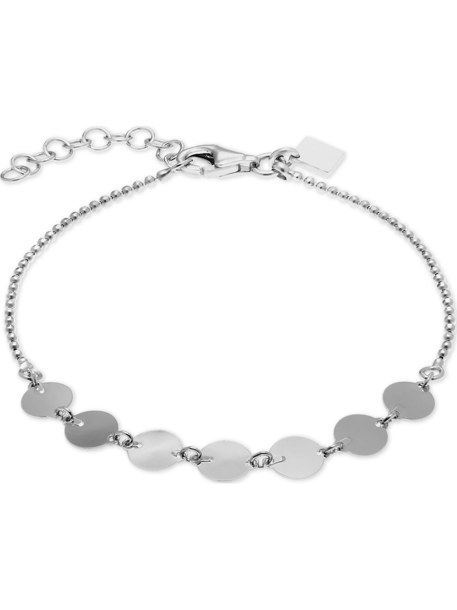 Die glänzende Armkette, die sich aus vielen Kügelchen zusammenfügt, geht in der Mitte in runde Plättchen über: Diese bringen das 925er Silber zum Glänzen. Aus diesen 2 Designs formt FAVS ein Armband im frischen Look, das den Frauen eine entspannte Aura verleiht. Edel und alltagstauglich, hochwertig und lässig, die Details verbinden sich harmonisch miteinander. Der unkomplizierte Armschmuck macht auf jeden Fall viel Spaß.