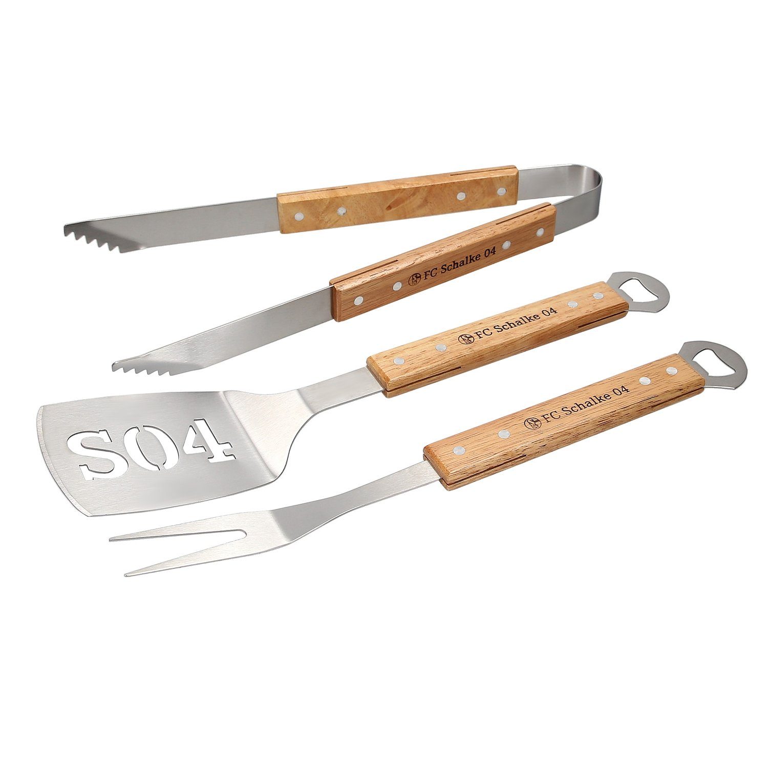Material: Holz, Metall. Длина: ca. 42 cm (Wender), ca. 40 cm (Gabel), ca. 38 cm (Zange). Farbe: silberfarben, braun. Все Teile besitzen eine praktische Aufhängung. Die Griffe sind mit einem Schalke-Logo sowie mit einem "FC Schalke 04"-Schriftzug versehen. Zusätzlich besitzt der Wender auf der ca. 11,6 x 10 cm großen Fläche ein ausgestanztes "S04". Mit diesem königsblauen Grillbesteck-Set steht einem Grillabend mit Freunden nichts mehr im Weg. Lieferumfang: 1 x Zange, 1 x Wender, 1 x Gabel.