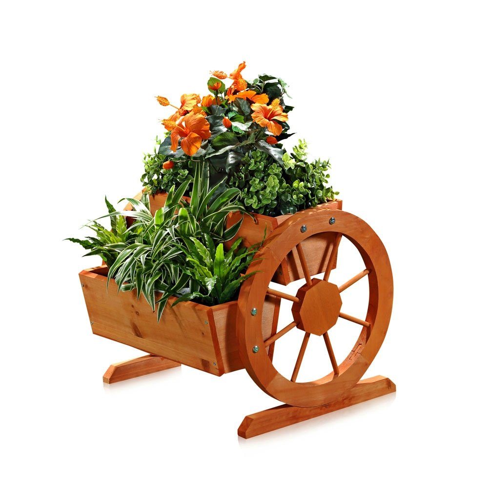 Sie benötigen keine teuren Skulpturen, um Ihrem Balkon oder Ihrer Terrasse einen zeitlosen Charme zu verleihen. Setzen Sie auf die Schönheit der Natur und rücken Sie farbenfrohe Blumen in den Vordergrund. Am besten gelingt Ihnen das mit diesem Pflanzenkasten. Das Modell erinnert optisch an ein Wasserrad und überzeugt durch seine liebevolle Verarbeitung mit edlen Details. Der Blumenkasten, der aus Fichtenholz gefertigt ist, verfügt über zwei Räder mit dünnen Stäben. Zwischen den beiden Rädern befinden sich zwei Blumenkästen, die untereinander platziert sind. Gerne können Sie in die einzelnen Kästen verschiedene Blumensorten einpflanzen. So entsteht ein farbenfrohes Pflanzenmeer, das sich harmonisch miteinander verbindet. Dank seiner zarten, leichten Gestaltung eignet sich der Blumenkasten auch zum Platzieren auf dem Tisch. Entdecken Sie das zeitlose Modell mit natürlicher Holzmaserung und pflanzen verwandeln Sie Ihre Blumen in attraktive Dekoartikel.