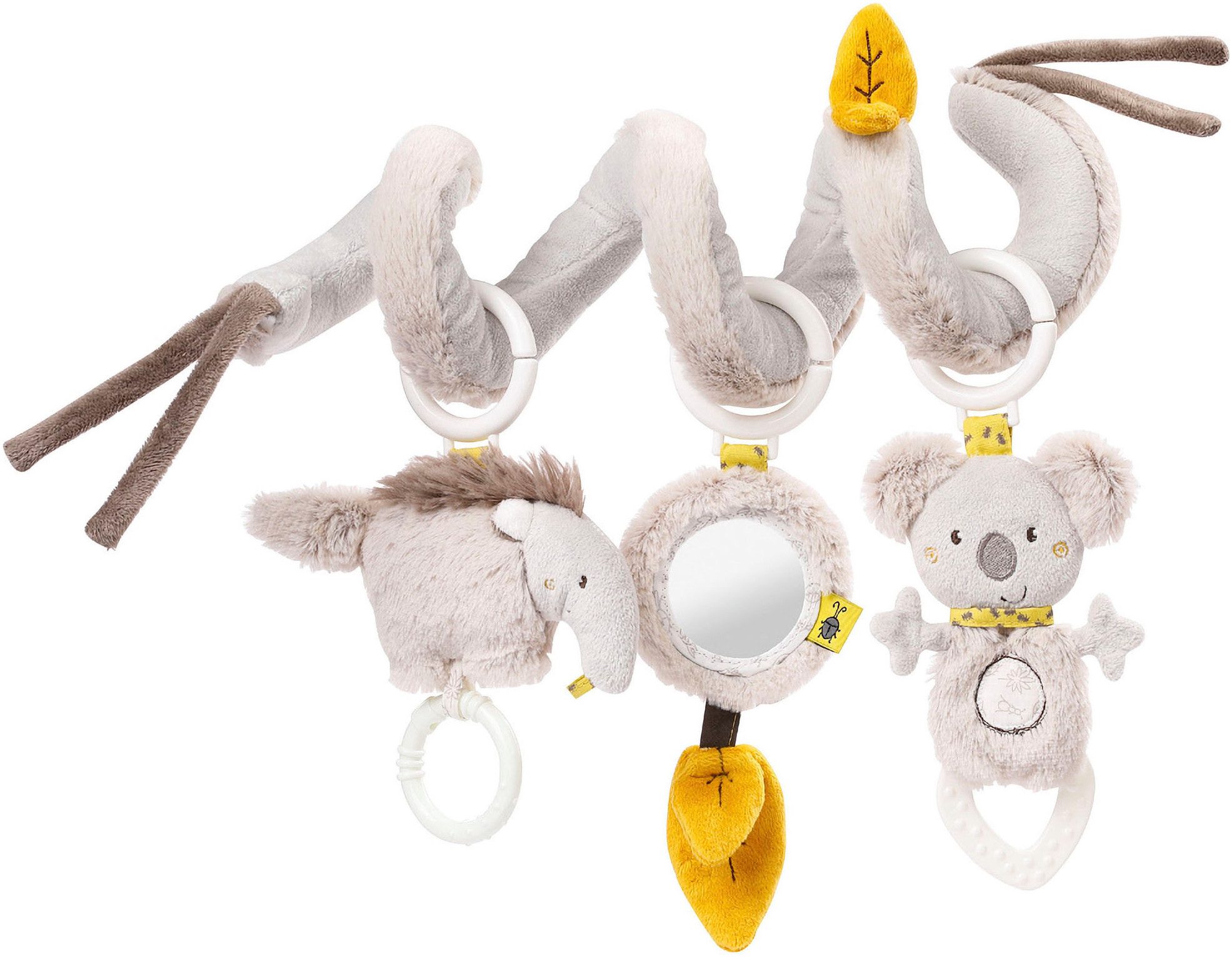 Stoff-Spirale mit Tier-Anhängern zum Greifen, Fühlen, Spielen, fördert Greif- und Tastsinn & die Feinmotorik, für Zuhause & Unterwegs, Für Babys und Kleinkinder ab 0+ Monaten. Erster Entdeckungs- und Spielspaß: Mit der Activity-Spirale aus der Australia Kollektion ist gute Laune garantiert! Die Stofftiere laden mit dem bunten Mix an Funktionen und Farben zum Beobachten, Spielen und Greifen ein. Rassel und Greifring am Ameisenbären, Quietsche und Beißer am Koala und der Spiegel mit raschelnden Blättern trainieren erste Hand-Auge-Koordination, sowie den Hör- und Tastsinn. Schnell und flexibel an Babyschale, Kinderwagen, Bettchen oder Laufgitter befestigt - damit wird jedes Abenteuer zum Erlebnis und keine Fahrt langweilig! Mit Quietsche, Rassel, Spiegel, Beißer, Greifring, Raschelpapier und Materialmix. Für Babys und Kleinkinder ab 0+ Monaten. Obermaterial: Plüsch, Velours, Stoff. Füllung: 100% Polyester.