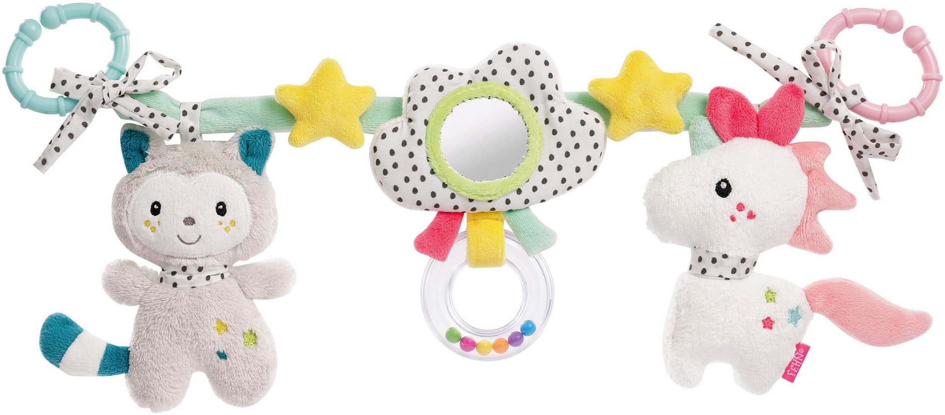 Die mobile Kinderwagenkette »Aiko & Yuki« von fehn® eignet sich mit ihren niedlichen Anhänger-Figuren perfekt zum Aufhängen an Kinderwagen, Babyschale, Bettchen, Wiege und Spielbogen. Spiegel und Rasselring an der Wolke, Rassel in der Katze und Quietsche im Einhorn laden zum Greifen und Fühlen ein, fördern erste Hand-Auge-Koordination und unterstützen spielerisch die Ich-Wahrnehmung. Schnelle und flexible Befestigung an Kinderwagen, Babyschale, Bettchen, Wiege oder Spielebogen – die Kinderwagenkette sorgt für einen einzigartigen Spielspaß egal ob zuhause oder unterwegs. Die Kette ist aus Plüsch, Softvelours und Stoff gefertigt und kann bei Bedarf per Handwäsche gereinigt werden.
