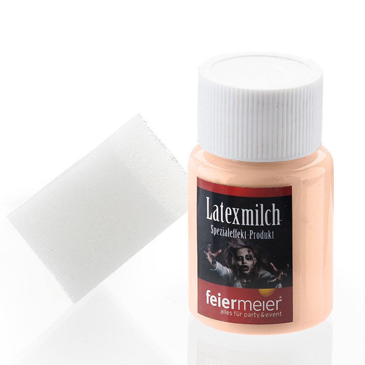 Unsere feiermeier Latexmilch ist ein Spezialprodukt von höchster Qualität und garantiert bei sachgemäßer Anwendung professionelle Ergebnisse. Trage die Horrorhaut einfach mit einem Wattestäbchen oder Pinsel auf und lasse sie trocknen. Du kannst in Kombination mit Kosmetiktüchern, Gaze oder anderen Materialien ganz eigene verblüffende Effekte modellieren. Nutze die Horrorhaut zum Beispiel, um Latexapplikationen anzukleben und perfekte, unsichtbare Übergänge zu schaffen. Dafür eignet sich die feiermeier Latexmilch perfekt Anwendungsbeispiele: Hautflächen Du kannst die Horrorhaut auch großflächig einsetzen. Tupfe diese dazu mit einem breiten Pinsel oder einem Schwamm auf Deine Haut auf und lasse sie dann ganz durchtrocknen. Deine Haut wird dadurch faltig und kränklich aussehen. Wenn Du Deine eigene Haut beim Auftragen und Trocknen spannst, werden sehr deutliche Falten entstehen. Du kannst die Horrorhaut dann mit einem Zahnstocher einreißen, um Hautrisse oder offene Blasen darzustellen. Profi-Effekte Verwende kleine Abrisse von Kosmetikpapier, um mit der Horrorhaut ganz eigene Effekte zu gestalten! Du kannst damit Wunden und abgerissene Haut darstellen. Mit etwas Gaze verwandelst Du Dein Gesicht in eine uralte Mumie. Dazu die Horrorhaut auftragen, die Gaze in Streifen auflegen und erneut mit etwas Flüssigkeit benetzen. Kleben Du kannst die Horrorhaut als Kleber für Latexapplikationen verwenden. Trage dazu einfach die Latexmilch sehr dünn auf die Klebefläche auf und lasse sie einige Minuten antrocknen. Alternativ kannst Du die Stelle wenige Sekunden mit einem Föhn trocknen. Die Flüssigkeit darf nicht ganz durchgetrocknet sein. Platziere dann die Applikation auf der Horrorhaut und drücke Sie sanft fest. Achte davei darauf, nicht in die Latexmilch zu fassen. Übergänge verdecken Wenn Du eine Latexapplikation mit Mastix oder Horrorhaut festgeklebt hast, kannst Du die Übergänge fast unsichtbar machen, indem Du einfach etwas Horrorhaut mit einem Wattestäbchen auf den Rand tu