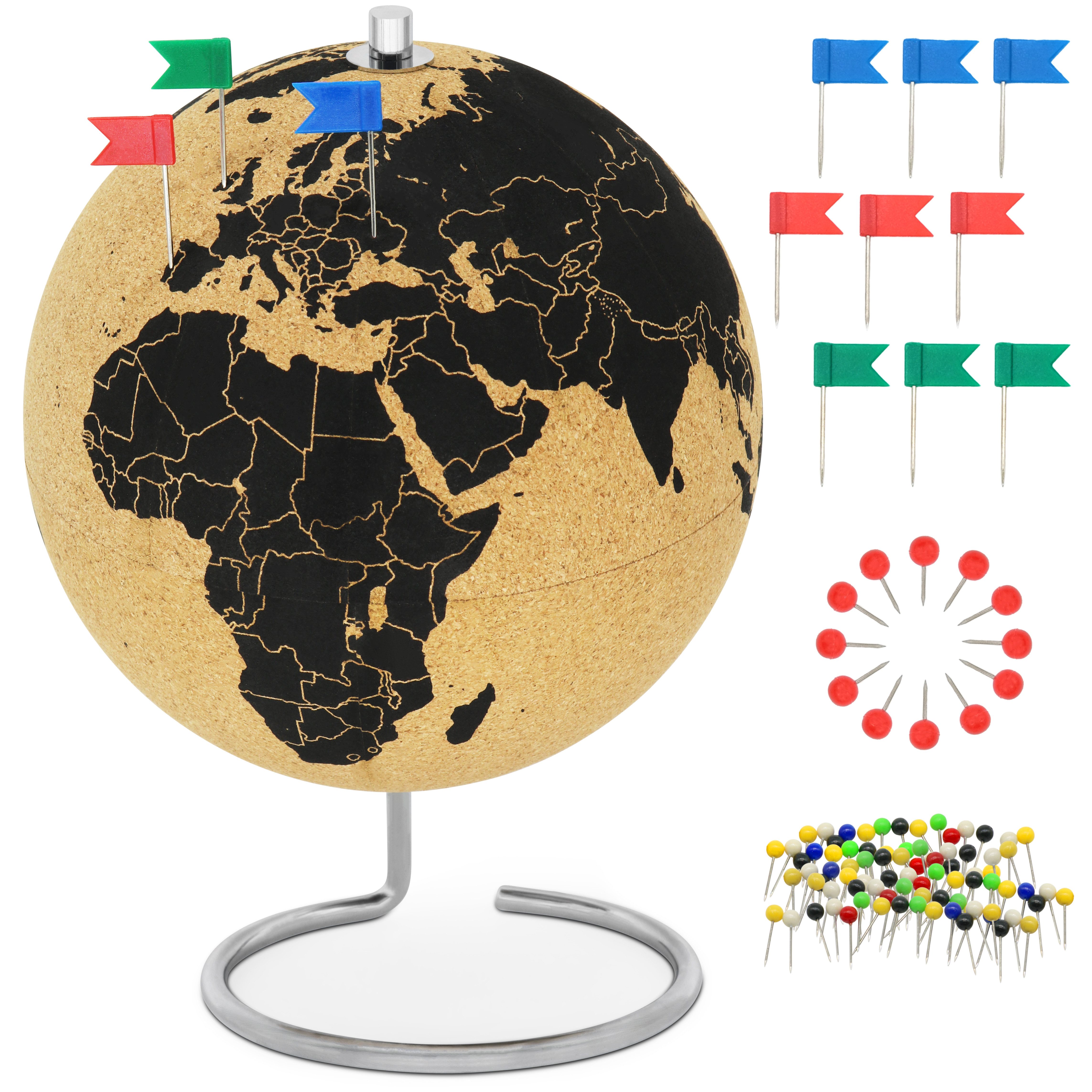 Ausstattung | mit Standfuß, 12 große rote Stecknadelpins, 30 kleine bunte Pins, 4 Fähnchenpins in blau, rot & grün, Drehbarer Korkglobus |