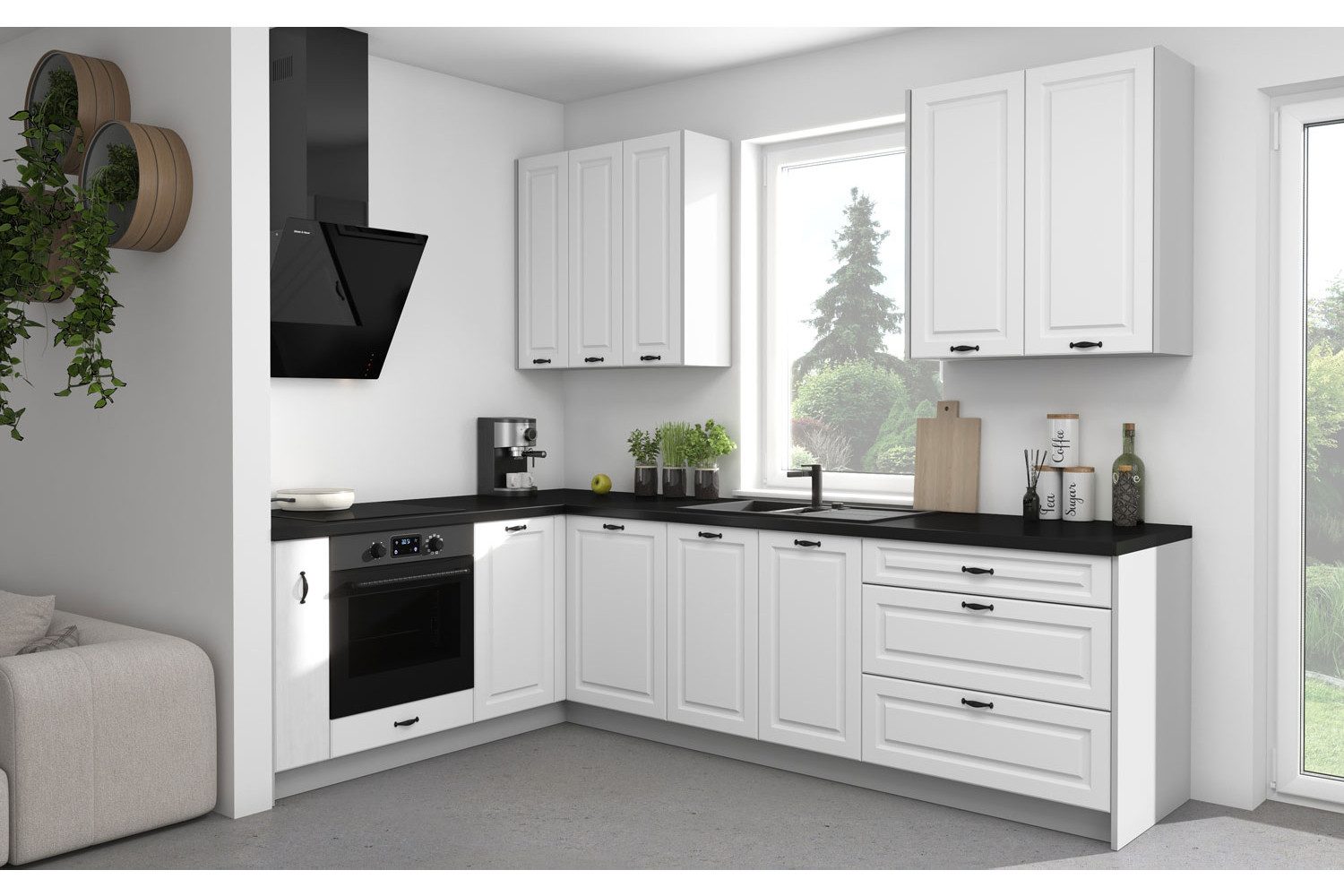 Set beinhaltet | 3 Hänge-, 1 Apothekerunter-, 1 Herdumbau-, 1 Eckverbindungs-, 1 Spülenunter-, 1 Schubladenunterschrank, 1 Geschirrspülerfront, 6 Abschlussrahmen |
