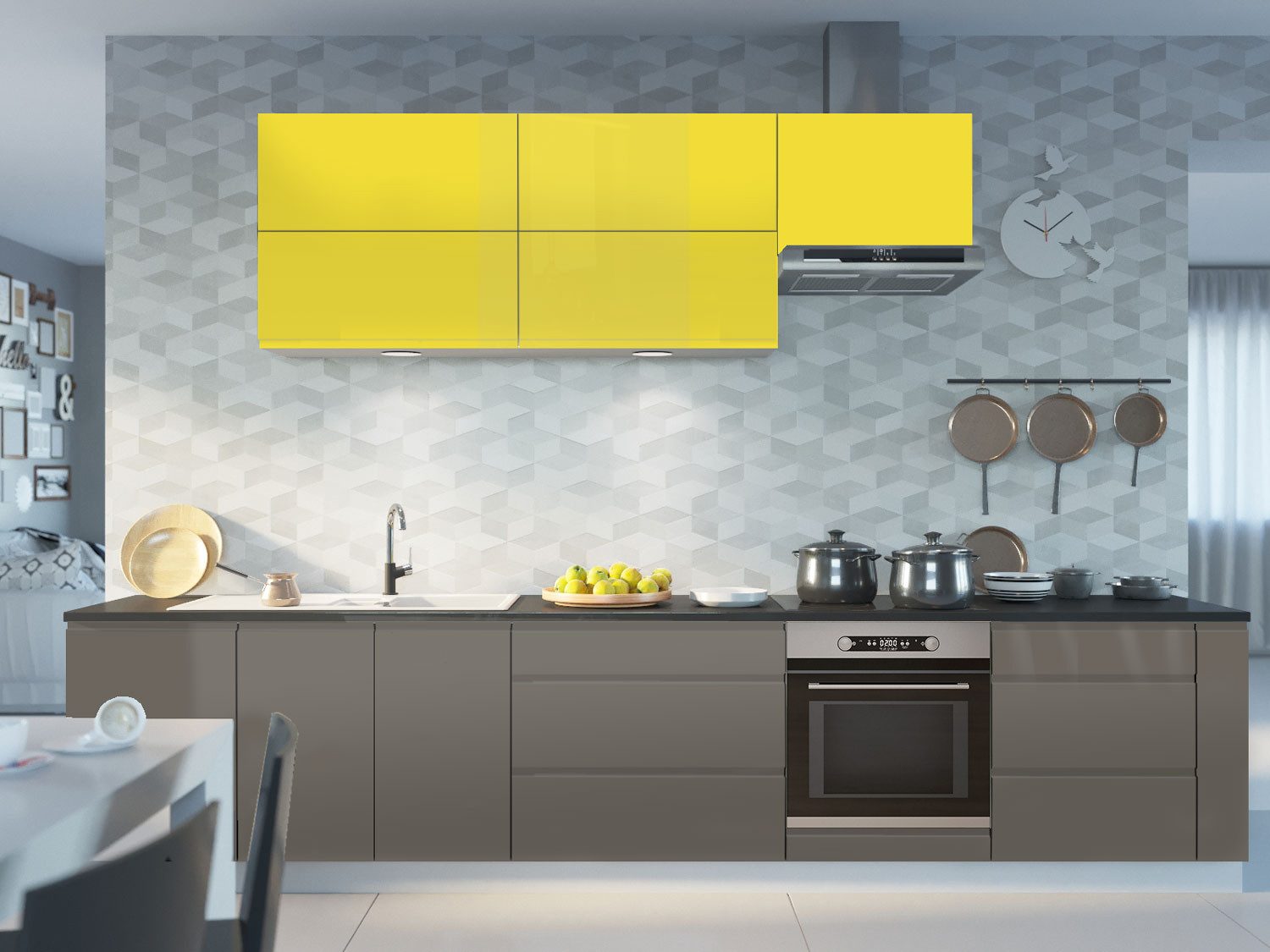 - Fronten: Hängeschränke RAL 1016-GL (schwefelgelb) / Unterschränke RAL 7039-GL (quarzgrau) (K7) Hochglanz lackiert