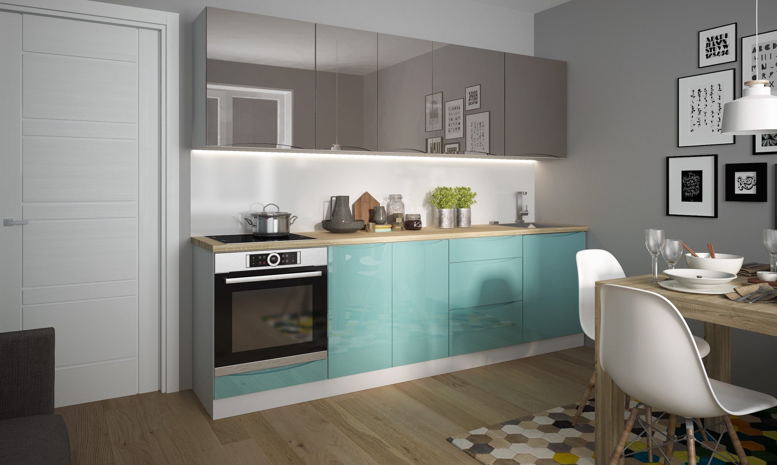 - Unterschränke: RAL 6027 lichtgrün Hochglanz lackiert
