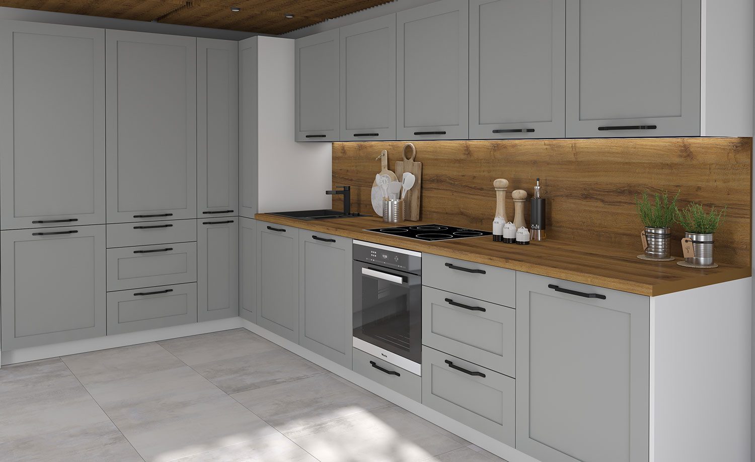 Das besondere Merkmal dieser Küchenzeile bilden die hochwertig beschichteten Fronten mit filigranen Fräsungen. Diese so entstandene Rahmenoptik verleiht Ihrer Küche einen modernen und zeitlosen Look.