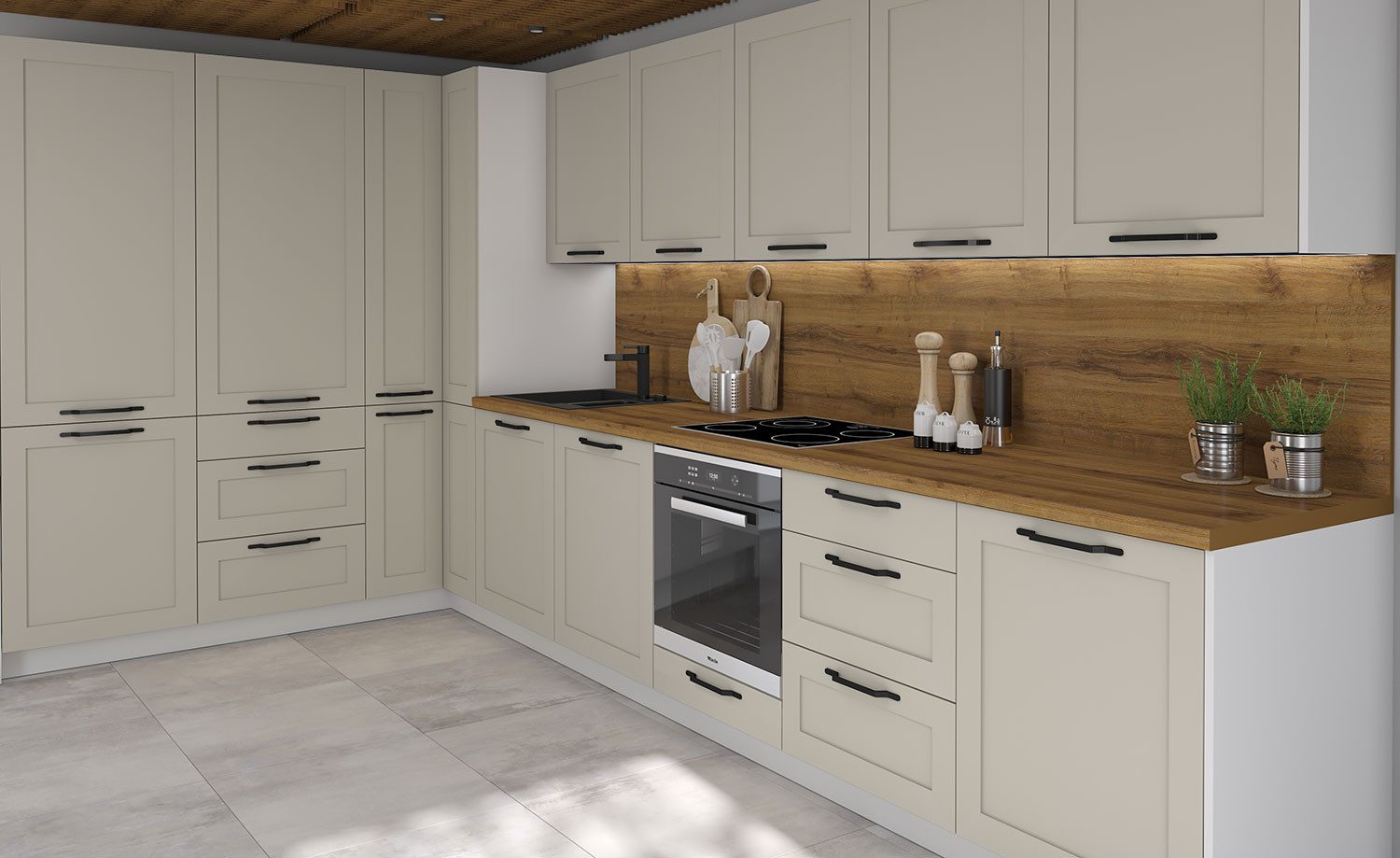 Das besondere Merkmal dieser Küchenzeile bilden die hochwertig beschichteten Fronten mit filigranen Fräsungen. Diese so entstandene Rahmenoptik verleiht Ihrer Küche einen modernen und zeitlosen Look.