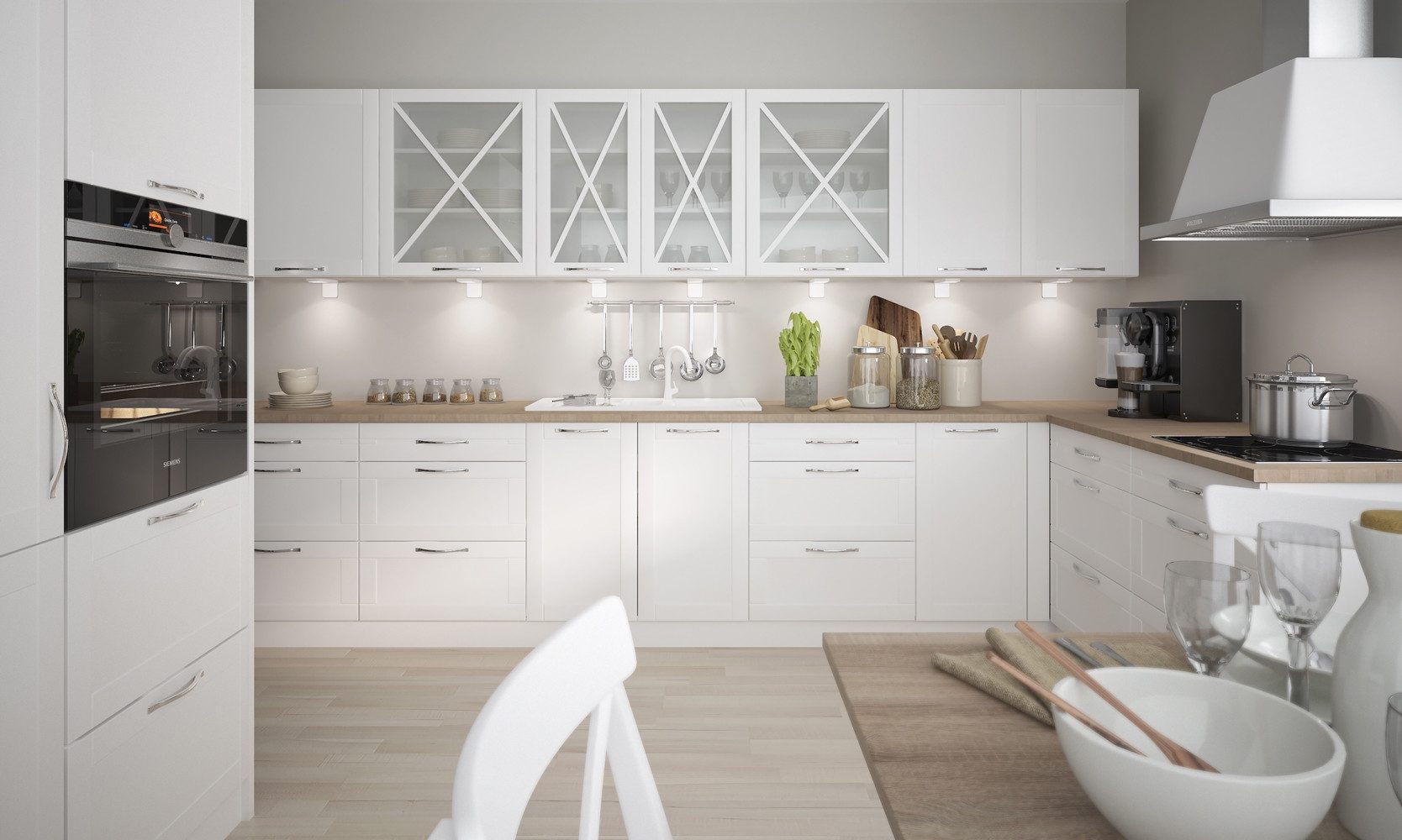 Set beinhaltet | 5x Hängeschränke, 5x Unterschränke, 1x Spülunterschrank, 1x Eck-Unterschrank, 2x Hochschränke |