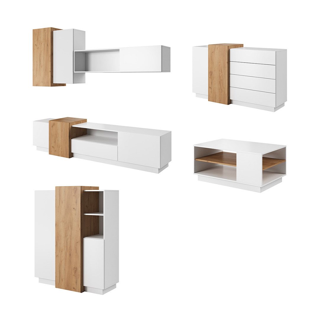 Lieferumfang | 1x Lowboard, 2x Hängeschränke, 1x Hängeregal, 1x Couchtisch, 2x Kommoden |