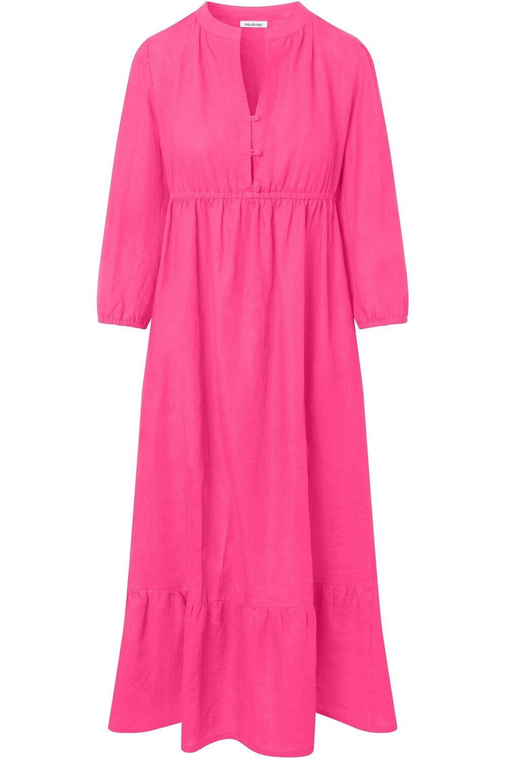 Das Maxi-Kleid Koralie von Felicitas fängt die Essenz des Sommers ein und besticht durch sein reines Leinenmaterial, das für angenehme Leichtigkeit und Atmungsaktivität sorgt. Der Rundhalsausschnitt wird durch einen kleinen Stehkragen und einen schmalen V-Ausschnitt elegant akzentuiert, was dem Kleid eine subtile Raffinesse verleiht. Die Knopfleiste im Oberteil mit feinen, überzogenen Knöpfen fügt dem Design eine klassische Note hinzu und sorgt für eine stilvolle Optik. Elegante Details für den perfekten Sommerlook