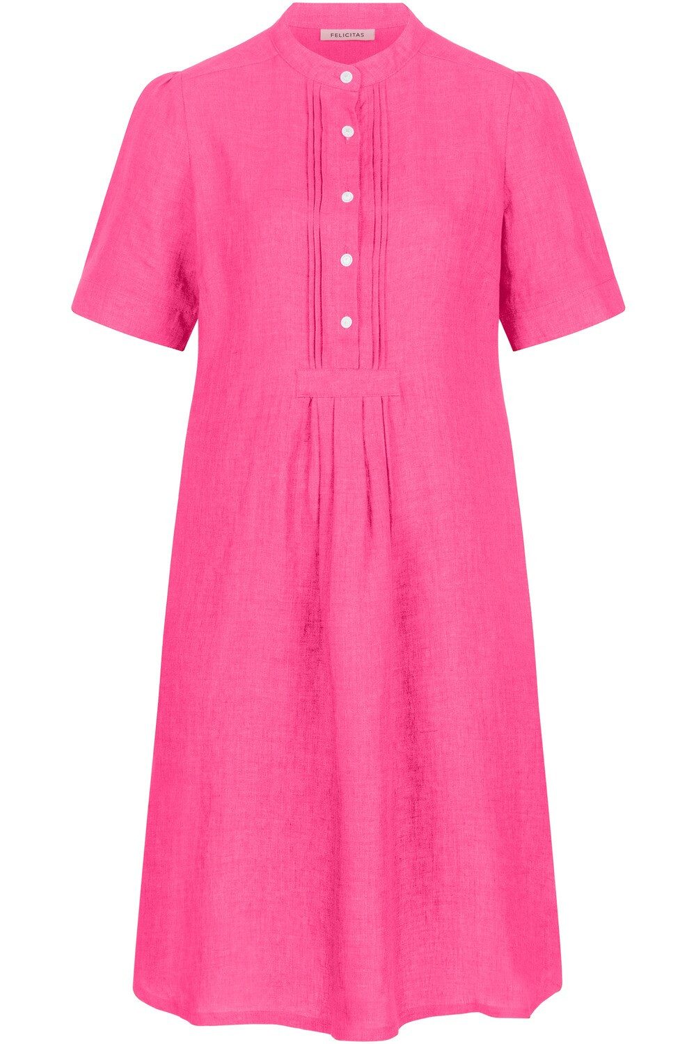 Das Blusenkleid Kleo 1/2 von FELICITAS vereint lässigen Chic mit zeitloser Eleganz. Hergestellt aus sommerlicher Leinenqualität, bietet dieses Kleid nicht nur einen angenehmen Tragekomfort, sondern auch eine luftige Eigenschaft, die besonders an warmen Tagen geschätzt wird. Die Biesen entlang der Knopfleiste verleihen dem Kleid eine raffinierte Note, während der Riegel in Taillenhöhe eine feminine Silhouette betont. Der kurze Stehkragen und die kurzen Ärmel sorgen für eine frische, moderne Ausstrahlung, die sich vielseitig kombinieren lässt. Praktische Nahttaschen fügen sich harmonisch in das Design ein und bieten zusätzlichen Komfort. Die Rückseite des Kleides ist mit einem Sattel und einer Kellerfalte gestaltet, was nicht nur für eine ansprechende Optik sorgt, sondern auch Bewegungsfreiheit garantiert. Mit einem abgerundeten Saum wird der Look des Blusenkleides abgerundet und verleiht ihm eine verspielte Note. Ob für den Alltag, im Büro oder zu besonderen Anlässen – das Blusenkleid Kleo 1/2 ist eine stilvolle Wahl, die sich mühelos in jede Garderobe integrieren lässt und für viele Gelegenheiten geeignet ist. Oberstoff: 100% Leinen