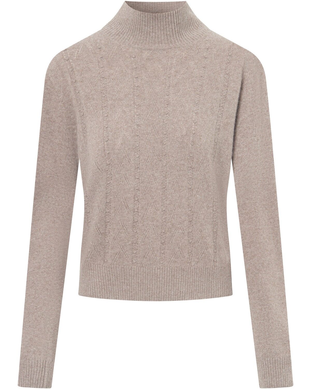 Luxuriöser Komfort und stilvolle Eleganz Der Damen Stehkragenpullover Pansy von Felicitas ist ein Ausdruck von luxuriösem Komfort und stilvoller Eleganz. Gefertigt aus einer hochwertigen Wolle-Kaschmir-Mischung, bietet dieser Pullover ein unvergleichlich weiches Tragegefühl und eine edle Optik. Der Stehkragen verleiht dem Modell eine elegante Note und sorgt zusammen mit den langen Ärmeln für zusätzliche Wärme an kühleren Tagen. Einzigartige Details und vielseitige Kombinationsmöglichkeiten Ein besonderes Highlight des Pullovers ist der Strickmix aus Ajour- und Bubblesmuster im Vorderteil, das dem Pullover eine interessante und ansprechende Optik verleiht. Dieser zeitlose Pullover eignet sich perfekt für verschiedene Anlässe und lässt sich mühelos vielseitig kombinieren. Ob casual mit Jeans und Sneakers oder elegant mit einer Stoffhose und Pumps – der Strickpullover Pansy ist ein vielseitiges Kleidungsstück, das in jeder Garderobe einen Platz verdient. Er ist die ideale Wahl für Frauen, die Wert auf Qualität und stilvolles Design legen. Oberstoff: 90% Wolle, 10% Kaschmir