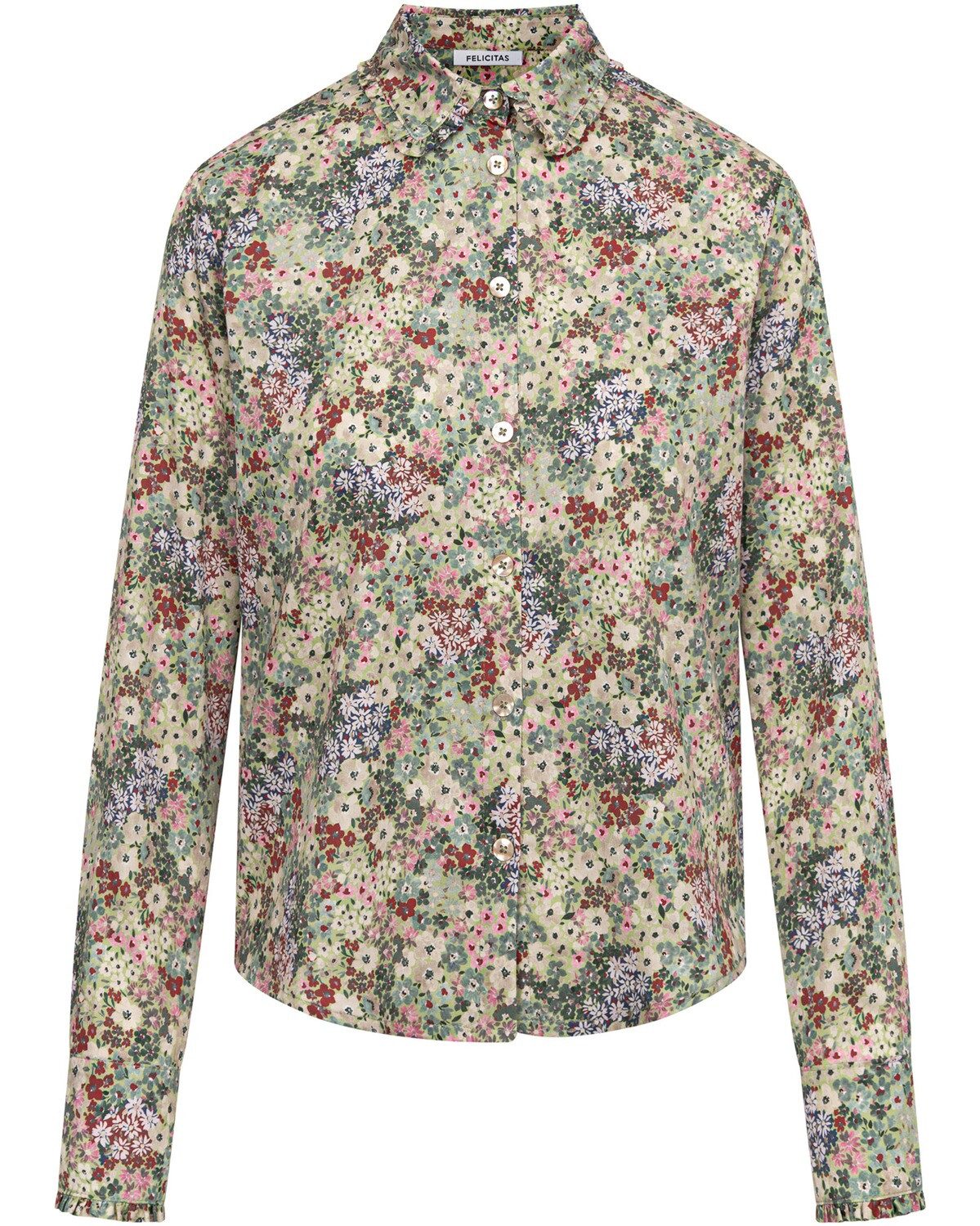 Die Damenbluse Bele von FELICITAS vereint zeitlose Eleganz mit einem frischen, floralen Design. Hergestellt aus 100 % reiner Baumwolle, bietet die Bluse nicht nur einen hohen Tragekomfort, sondern auch eine angenehme Qualität, die ideal für jede Jahreszeit ist. Der bezaubernde Blumenprint verleiht dem Kleidungsstück eine fröhliche Note und macht es zu einem echten Blickfang. Besondere Details wie der Umlegekragen mit Rüschen und die Knopfleiste, die mit echten Perlmuttknöpfen verziert ist, setzen stilvolle Akzente. Die langen Ärmel sind mit 3-Knopf-Manschetten ausgestattet, die ebenfalls mit Rüschen versehen sind, was der Bluse einen romantischen und femininen Charme verleiht. Das Rückenteil mit Sattel und Falte sorgt nicht nur für eine optimale Passform, sondern auch für eine ansprechende Silhouette. Die Bluse Bele lässt sich vielseitig kombinieren und eignet sich sowohl für legere Alltagslooks als auch für schickere Anlässe. Ob zu Jeans, einer eleganten Hose oder einem Rock – dieses Kleidungsstück bringt einen Hauch von Frische und Stil in jede Garderobe. Ein Must-Have für modebewusste Frauen, die Wert auf Qualität und Design legen. Oberstoff: 100% Baumwolle