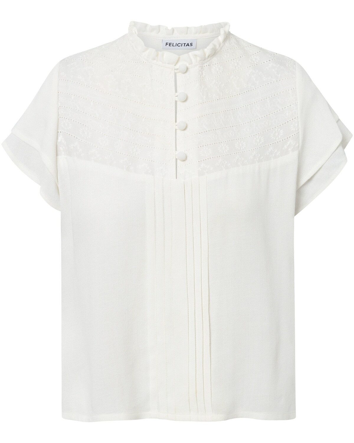 Eine perfekte Wahl für stilvolle Anlässe Diese Damen Halbarm-Bluse kombiniert Eleganz mit traditionellem Charme. Aus reiner Viskose gefertigt, bietet sie ein angenehm weiches Tragegefühl. Der aufwendig gearbeitete Lochstickeinsatz im oberen Teil und die Biesen vorne mittig verleihen der Bluse eine besondere Note. Der kurze Rüschenstehkragen und die Flügelärmel sorgen für einen klassischen Look, der sich ideal zu verschiedenen Anlässen tragen lässt.