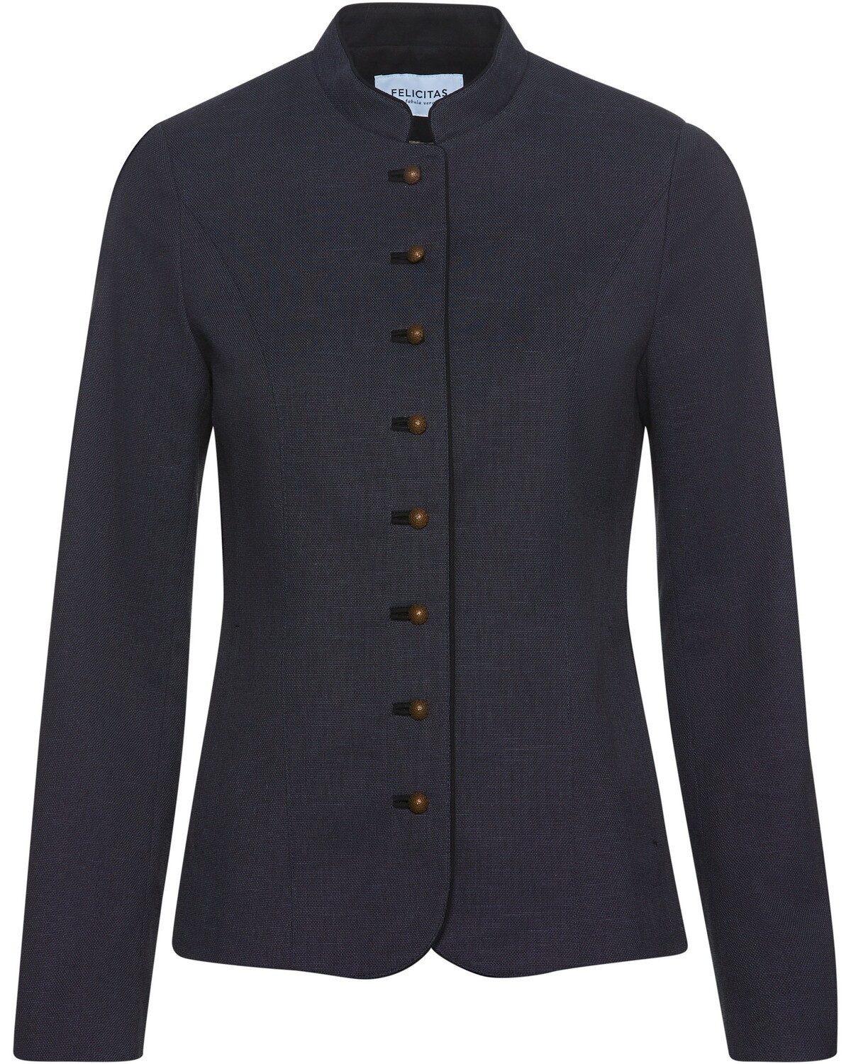 Die Damenjacke Jannika von FELICITAS präsentiert sich als zeitloses Kleidungsstück, das Eleganz und Vielseitigkeit vereint. Mit ihrem kleinen Stehkragen und den kontrastfarbigen Paspeln an Kragen und vorderer Kante wird der klassische Look der Jacke stilvoll akzentuiert. Diese Details verleihen der Jacke nicht nur einen schönen Rahmen, sondern setzen auch modische Akzente, die sie zu einem echten Hingucker machen. Das Rückenteil der Jacke ist mit einem Schößchen und einer Quetschfalte versehen, was für eine feminine Silhouette sorgt und gleichzeitig Bewegungsfreiheit bietet. Diese durchdachten Designelemente tragen dazu bei, dass die Jacke sowohl in formellen als auch in lässigen Situationen getragen werden kann. Die Jannika Jacke ist ein wahrer Allrounder und lässt sich mühelos zu verschiedenen Outfits kombinieren. Ob zum Dirndl für festliche Anlässe oder zu einem Rock oder einer Hose für den Alltag – diese Jacke passt sich jeder Gelegenheit an und ist somit ein unverzichtbares Teil in jeder Garderobe. Mit ihrer hochwertigen Verarbeitung und dem klassischen Design ist die Damenjacke Jannika eine stilvolle Wahl für modebewusste Frauen. Oberstoff: 66% Baumwolle, 19% Polyester, 11% Viskose, 2% Leinen, 2% Elasthan; Futter: 40% Acetat, 30% Baumwolle, 30% Polyester