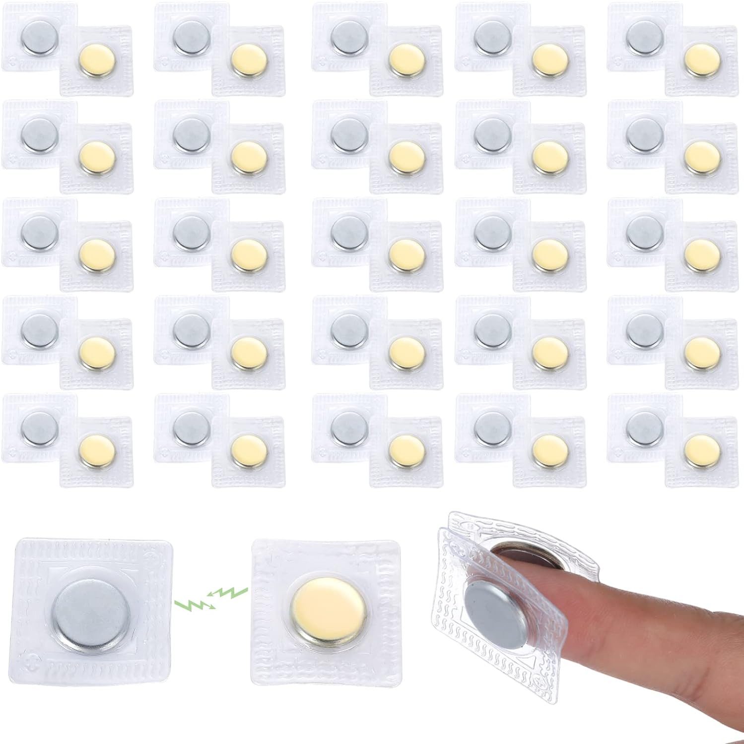 Warmer Hinweis: Der gelbe Magnet ist positiv, der silberne ist negativ und eignet sich besser für leichte Stoffe. Bitte stellen Sie sicher, dass der Magnet zum Magneten zeigt, wenn Sie ihn in Ihre Kleidung einnähen.