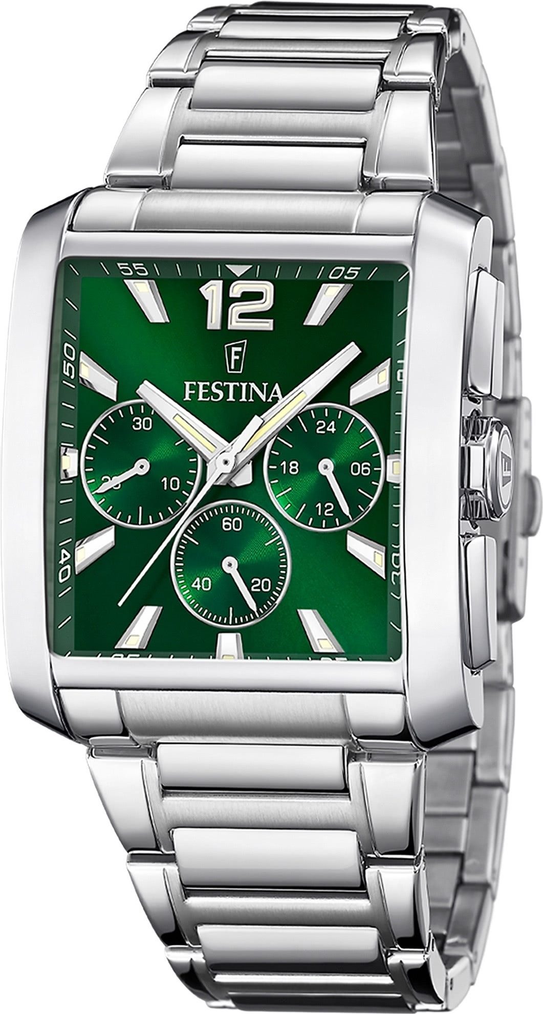 Die Elegant Uhr der Marke Festina hat ein schönes Armband aus Edelstahl in silber mit Faltschließe. Eine Uhr aus der Festina Timeless Chronograph Kollektion für Herren in der Gehäusefarbe silber . Die Chronographuhr mit Mineralglas hat ein Zifferblatt in der Farbe grün. Die Form der Uhr ist eckig und das Gehäuse ist mittel ca. 37mm.