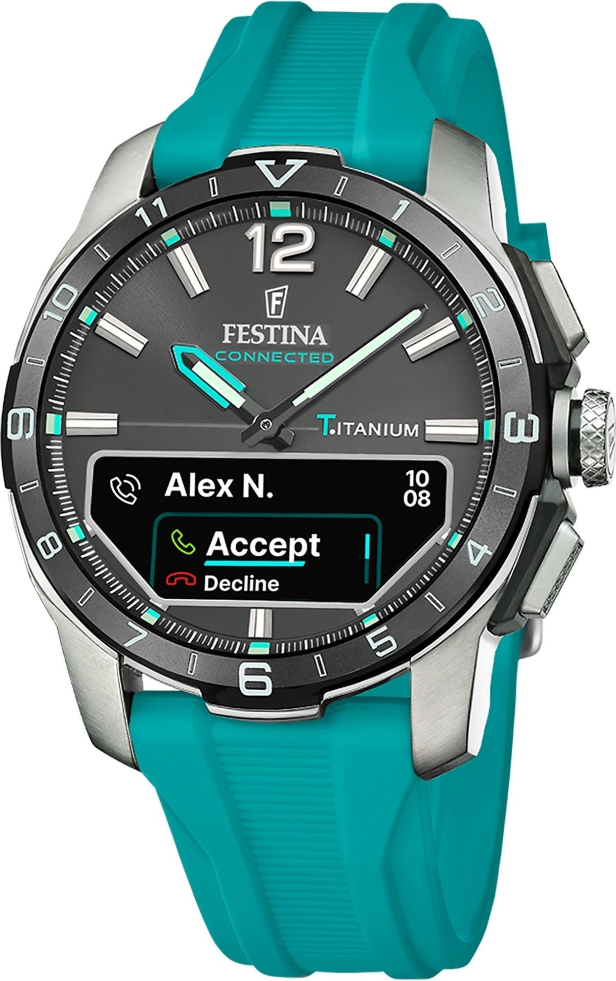 Die Elegant Sport Uhr der Marke Festina hat ein schönes Armband aus Silikon in türkis mit Dornschließe. Eine Uhr aus der Festina Connected Kollektion für Herren in der Gehäusefarbe schwarz . Die Multifunktionuhr mit Saphirglas hat ein Zifferblatt in der Farbe schwarz. Die Form der Uhr ist rund und das Gehäuse ist groß ca. 44mm.