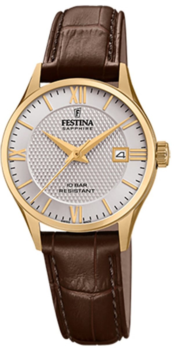 Die Elegant Uhr der Marke Festina hat ein schönes Armband aus Leder in braun mit Dornschließe. Eine Uhr aus der Festina Swiss Made Kollektion für Damen in der Gehäusefarbe gold mit Quarz. Die Analoguhr mit Saphirglas hat ein Zifferblatt in der Farbe silber. Die Form der Uhr ist rund und das Gehäuse ist klein ca. 29mm.