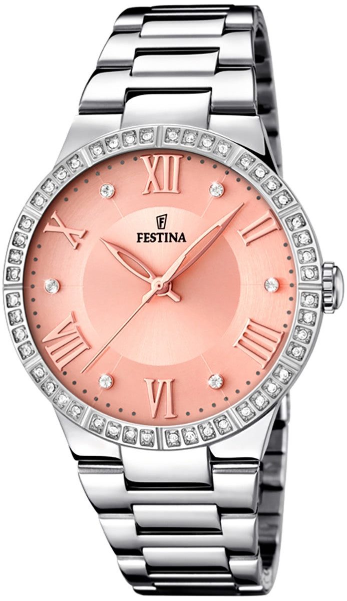 Die Fashion Uhr der Marke Festina hat ein schönes Armband aus Edelstahl in silber mit Faltschließe. Eine Uhr aus der Festina Trend Kollektion für Damen in der Gehäusefarbe silber mit Quarzwerk. Die Analoguhr mit Mineralglas hat ein Zifferblatt in der Farbe kupfer. Die Form der Uhr ist rund und das Gehäuse ist mittel ca. 37mm.