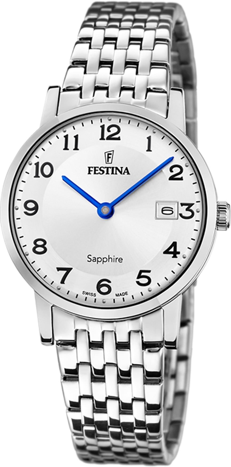 Die Elegant Uhr der Marke Festina hat ein schönes Armband aus Edelstahl in silber mit KippFaltschließe mit Druckknopf. Eine Uhr aus der Festina Swiss Made Kollektion für Damen in der Gehäusefarbe silber . Die Analoguhr mit Saphirglas hat ein Zifferblatt in der Farbe weiß. Die Form der Uhr ist rund und das Gehäuse ist klein ca. 29,3mm.