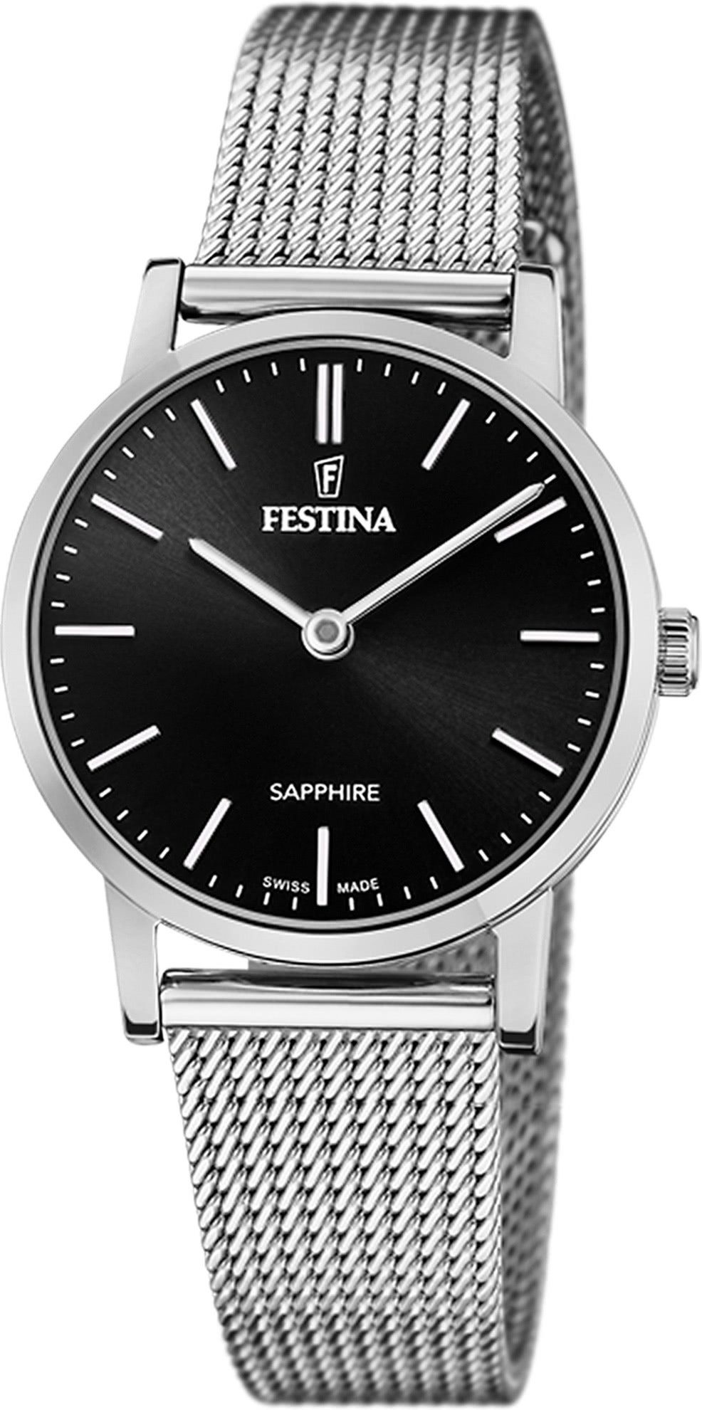 Die Elegant Uhr der Marke Festina hat ein schönes Armband aus Edelstahl in silber mit Klappverschluss. Eine Uhr aus der Festina Swiss Made Kollektion für Damen in der Gehäusefarbe silber . Die Analoguhr mit Saphirglas hat ein Zifferblatt in der Farbe schwarz. Die Form der Uhr ist rund und das Gehäuse ist klein ca. 29mm.