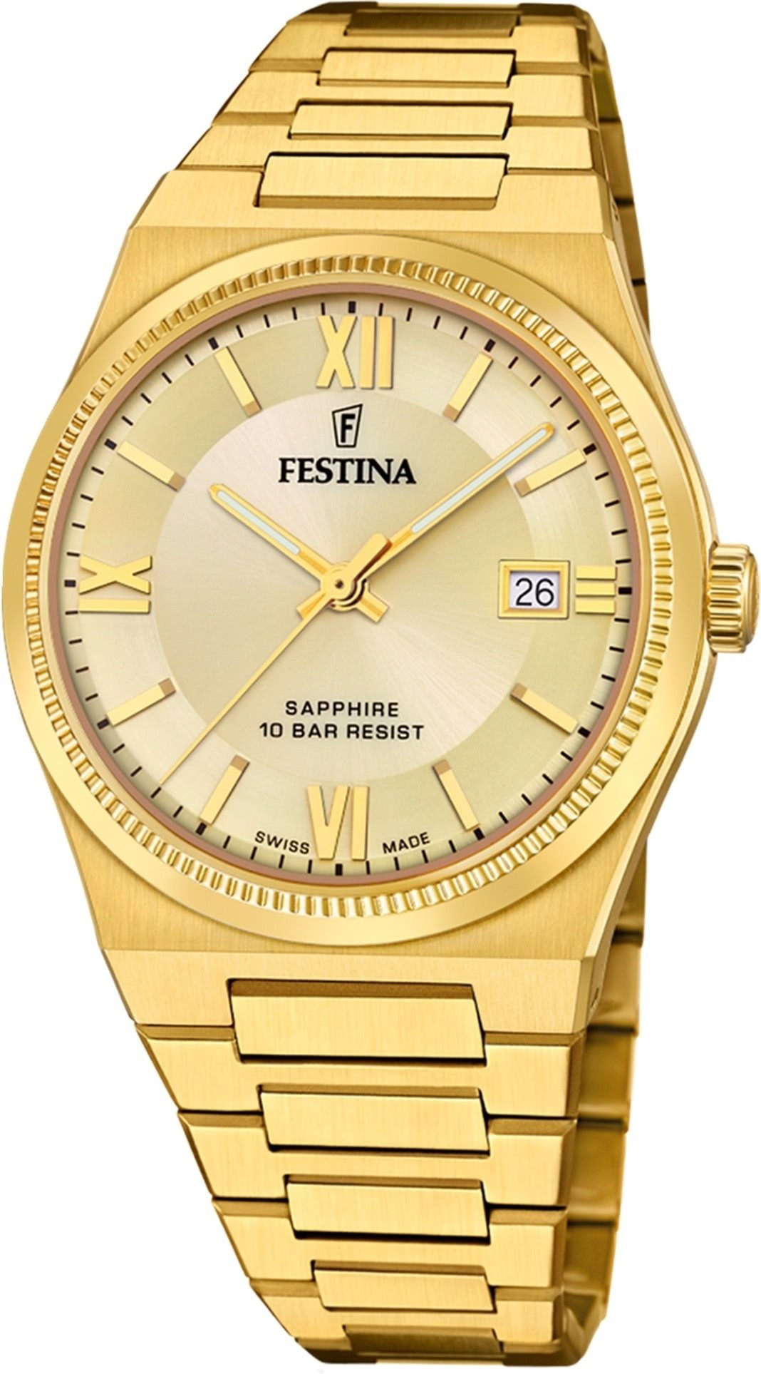Die Elegant Uhr der Marke Festina hat ein schönes Armband aus Edelstahl in gold mit Butterfly-Faltschließe versteckt. Eine Uhr aus der Festina Swiss Made Kollektion für Herren in der Gehäusefarbe gold . Die Analoguhr mit Saphirglas hat ein Zifferblatt in der Farbe gold. Die Form der Uhr ist rund und das Gehäuse ist groß ca. 40mm.