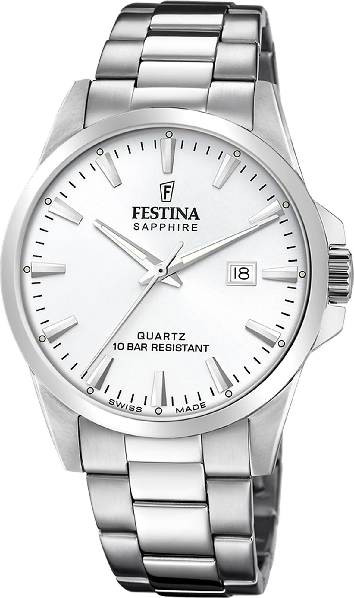 Die Elegant Uhr der Marke Festina hat ein schönes Armband aus Edelstahl in silber mit Faltschließe. Eine Uhr aus der Festina Swiss Made Kollektion für Herren in der Gehäusefarbe silber . Die Analoguhr mit Saphirglas hat ein Zifferblatt in der Farbe silber. Die Form der Uhr ist rund und das Gehäuse ist groß ca. 41mm.