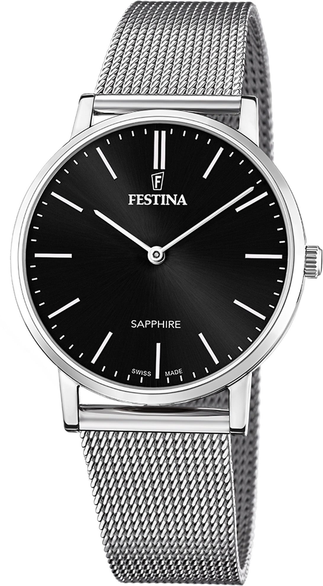 Die Elegant Uhr der Marke Festina hat ein schönes Armband aus Edelstahl in silber mit Klappverschluss. Eine Uhr aus der Festina Swiss Made Kollektion für Herren in der Gehäusefarbe silber . Die Analoguhr mit Saphirglas hat ein Zifferblatt in der Farbe schwarz. Die Form der Uhr ist rund und das Gehäuse ist mittel ca. 39mm.