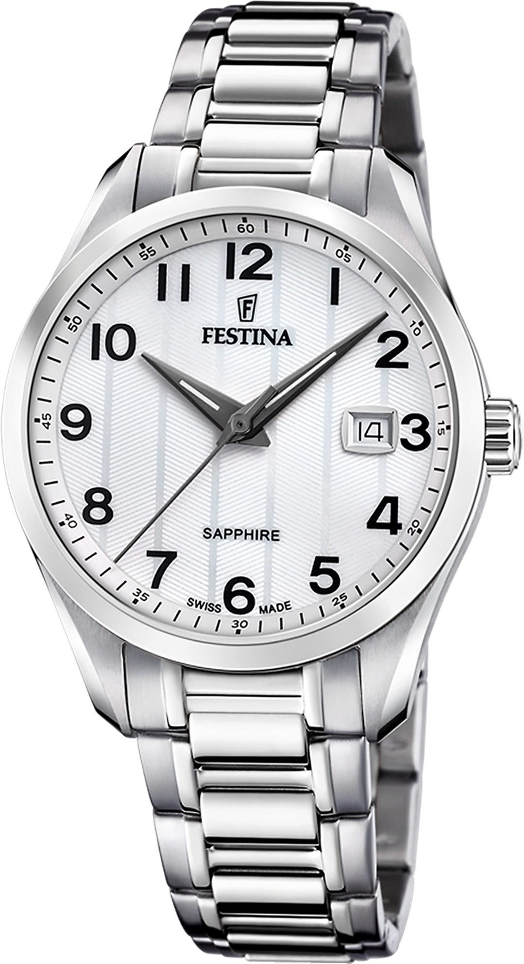 Die Elegant Uhr der Marke Festina hat ein schönes Armband aus Edelstahl in silber mit Faltschließe. Eine Uhr aus der Festina Swiss Made Kollektion für Herren in der Gehäusefarbe silber . Die Analoguhr mit Saphirglas hat ein Zifferblatt in der Farbe weiß. Die Form der Uhr ist rund und das Gehäuse ist mittel ca. 37,5mm.