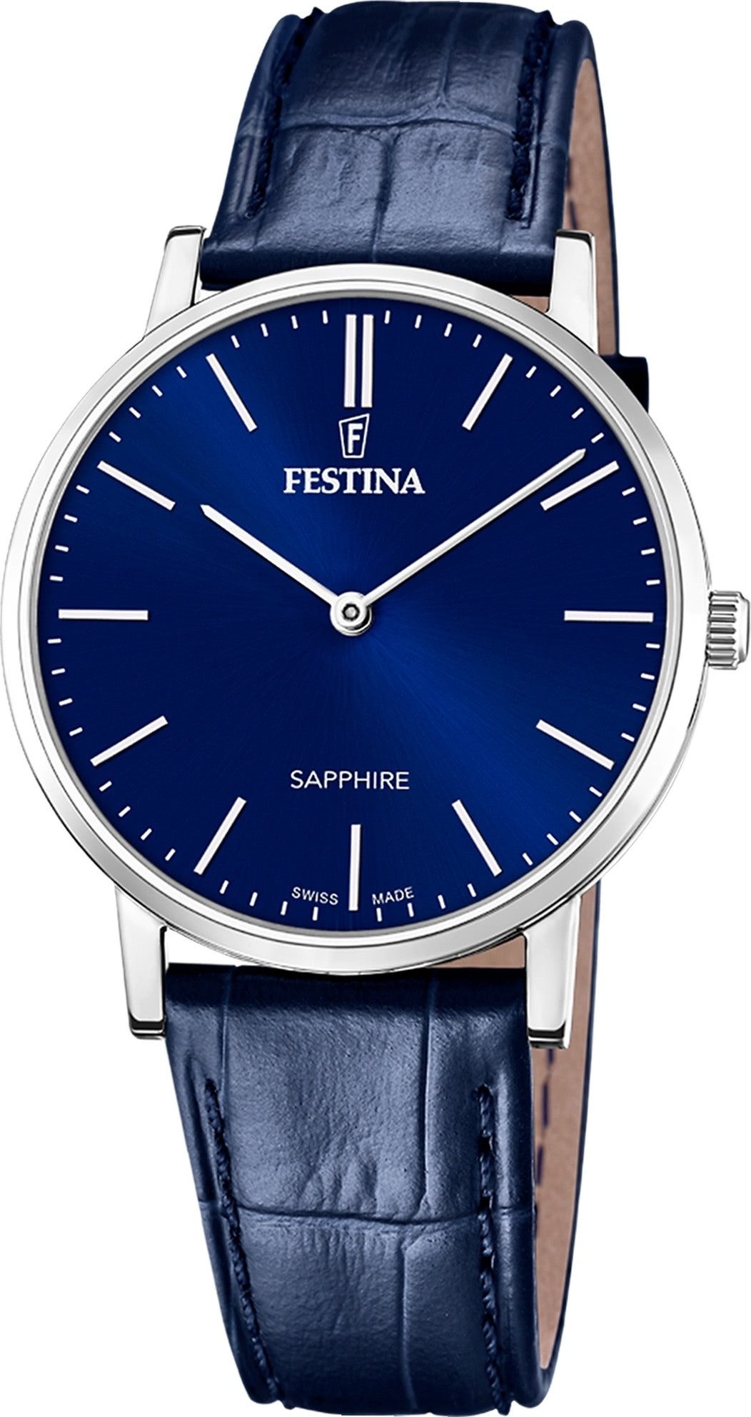 Die Elegant Uhr der Marke Festina hat ein schönes Armband aus Leder in blau mit Dornschließe. Eine Uhr aus der Festina Swiss Made Kollektion für Herren in der Gehäusefarbe silber . Die Analoguhr mit Saphirglas hat ein Zifferblatt in der Farbe blau. Die Form der Uhr ist rund und das Gehäuse ist mittel ca. 39mm.