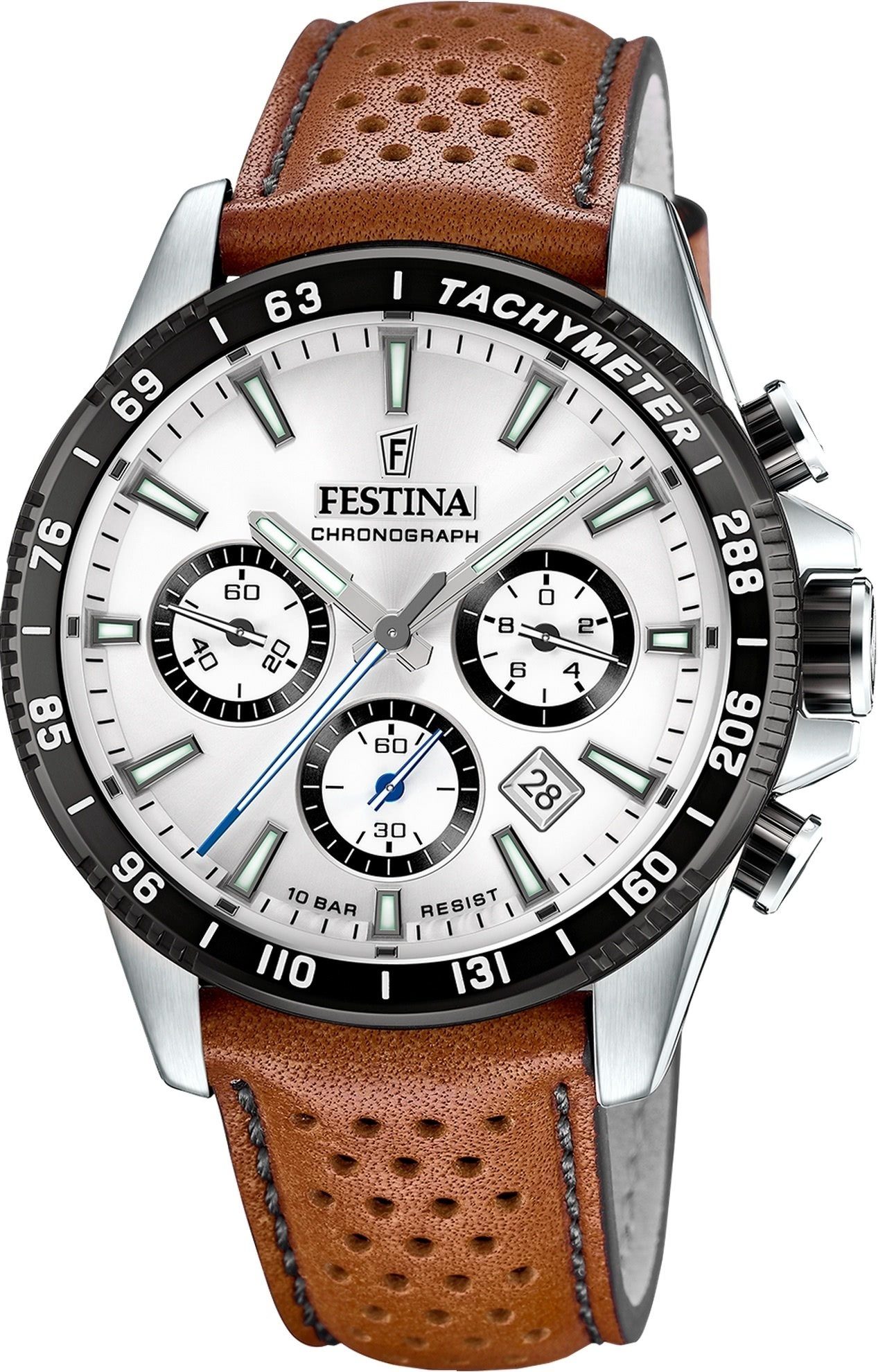 Die Elegant Uhr der Marke Festina hat ein schönes Armband aus Leder in braun mit Dornschließe. Eine Uhr aus der Festina Timeless Chronograph Kollektion für Herren in der Gehäusefarbe silber . Die Analoguhr mit Mineralglas hat ein Zifferblatt in der Farbe silber schwarz. Die Form der Uhr ist rund und das Gehäuse ist groß ca. 45mm.