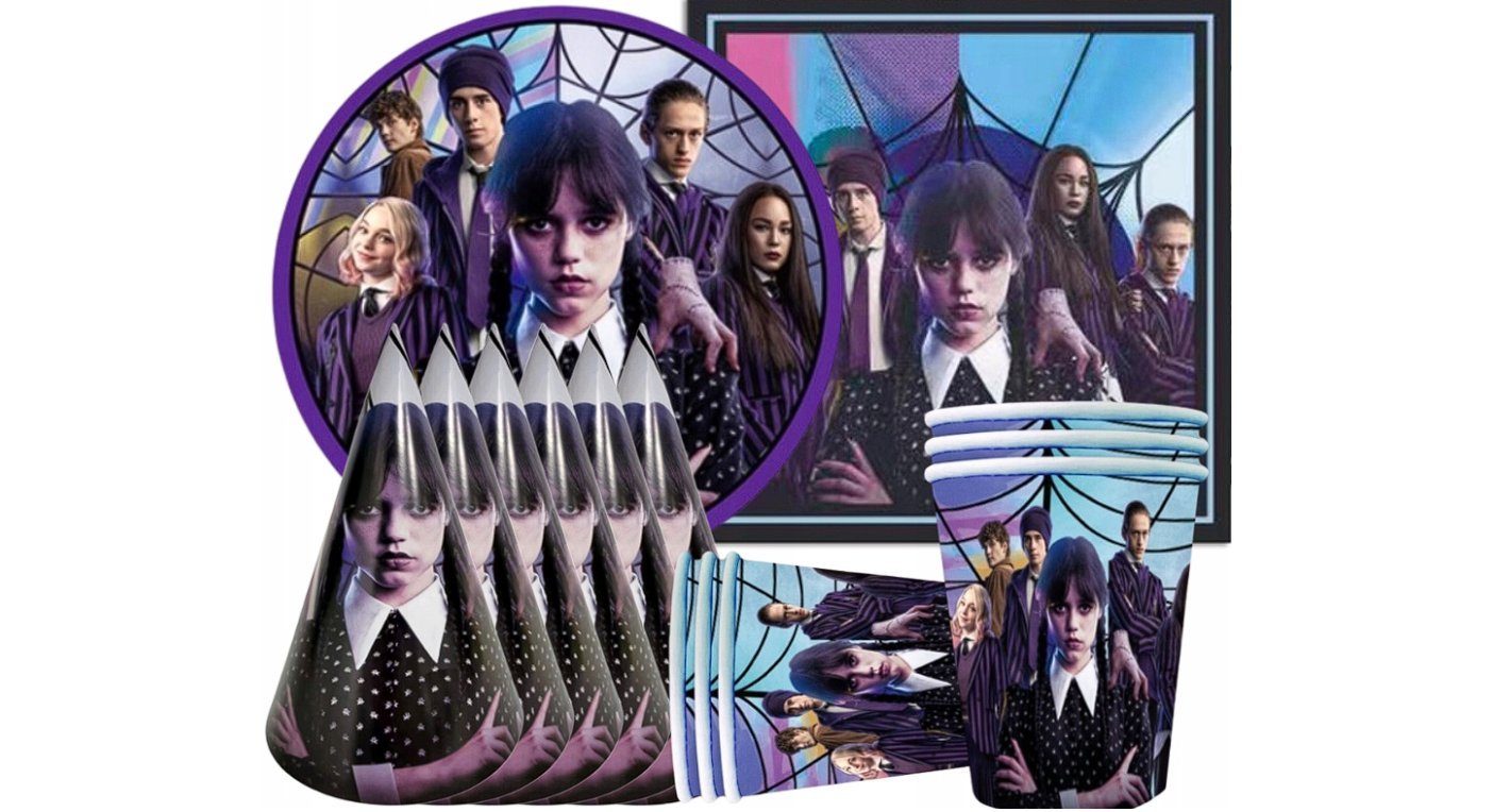 Geburtstagsset Wednesday Addams, 46-teilig, Becher Teller Servietten Mützen, limitierte Auflage, lebendige Farben, langlebig, ideal für Geburtstage, Maße: Becher 8x7 cm, Teller Durchmesser 17,5 cm, Serviette gefaltet 16x16 cm, Mützen mit Gummiband 19,5 x 13 cm.