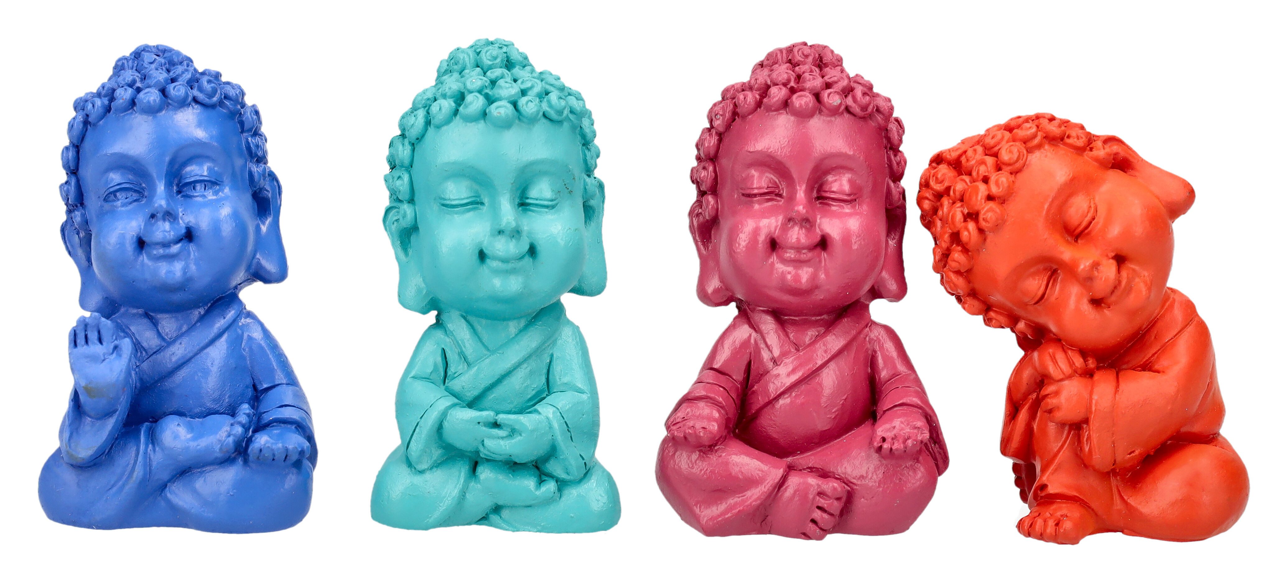 Vier glücklich und zufrieden aussehende bunte Buddha Figuren mit unterschiedlichen Haltungen und Handgesten sind in diesem Set enthalten. Jede Geste, jede Haltung hat eine besondere und segnende Bedeutung. Die 5 6 cm hohen, je 3 cm breiten und je 3 cm tiefen Buddha Figuren sind aus liebevoll handbemaltem Kunststein (Polyresin). In den vier Ecken eines Raumes aufgestellt, sind sie ein besonderer Schutz und damit aber auch ein symbolhaftes Geschenk.