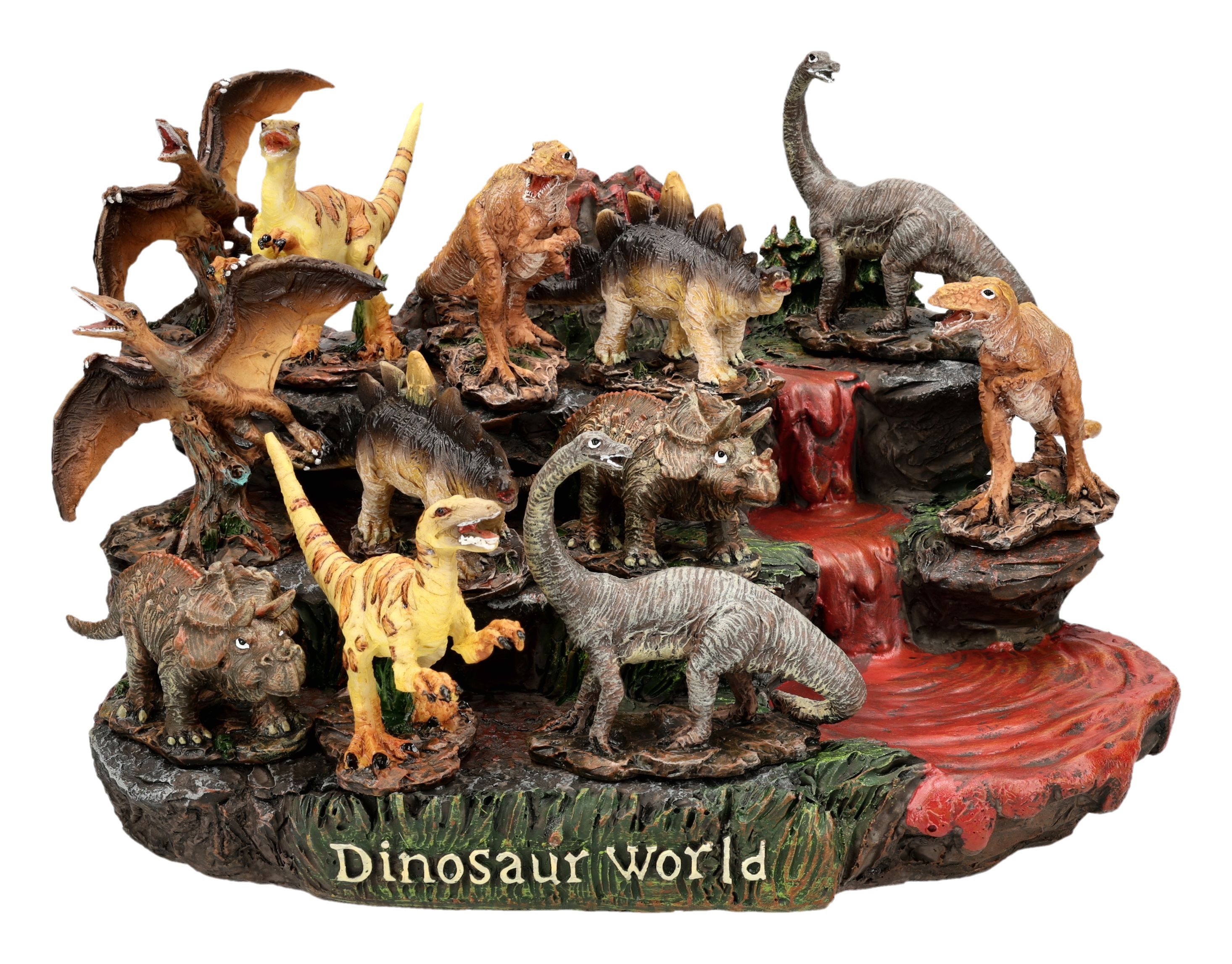Erlebe die Urzeit hautnah mit diesem Dinosaurier Figuren Set, bestehend aus einem detailreichen Vulkan Display und 36 individuell gestalteten Dinos. Sechs verschiedene Dinosaurier-Arten, darunter imposante Flugsaurier, versammeln sich auf einer dreistufigen Vulkaninsel, die gerade Lava speit – perfekt inszeniert für Sammler, Dinosaurier-Fans und Deko-Liebhaber.