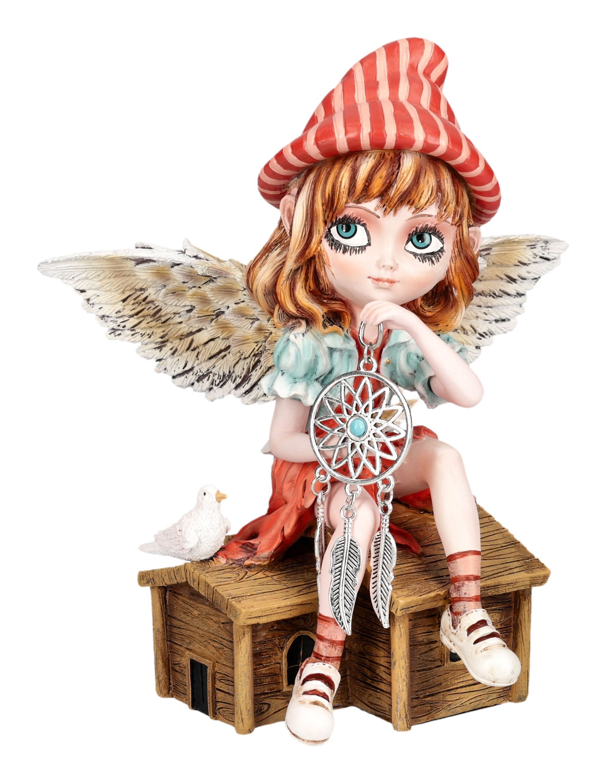 Die liebevoll handbemalte Elfenfigur zeigt Autumn Fae in einem verspielten Outfit mit süßer Mütze. An ihrer Seite sitzt eine Taube, die gemeinsam mit ihr einen kunstvollen Traumfänger betrachtet – Symbol für Schutz, Kreativität und Geborgenheit.