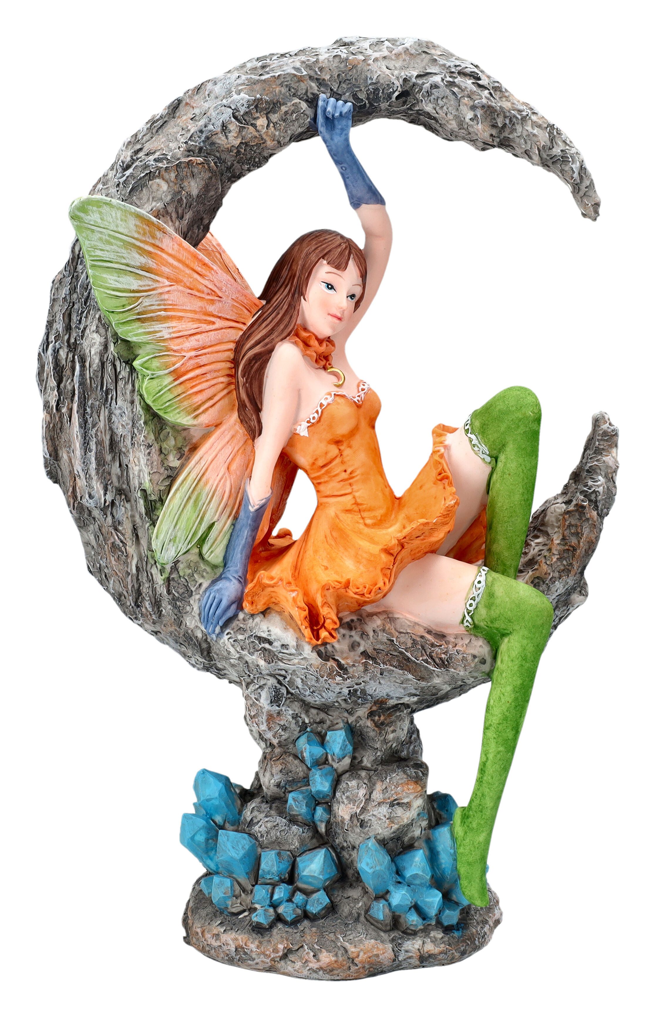 Mit ihrem frühlingshaften orangen Kleid, den frechen grünen Strümpfen und den ausgebreiteten, zarten Flügeln ist sie ein wunderschöner Blickfang. Um ihren Hals trägt sie eine Mondkette als Zeichen ihrer Verbundenheit zur Mondgöttin. Diese detailreiche und kunstvoll gestaltete Elfen Figur ist aus hochwertigem Kunststein (Polyresin) gefertigt und handbemalt.