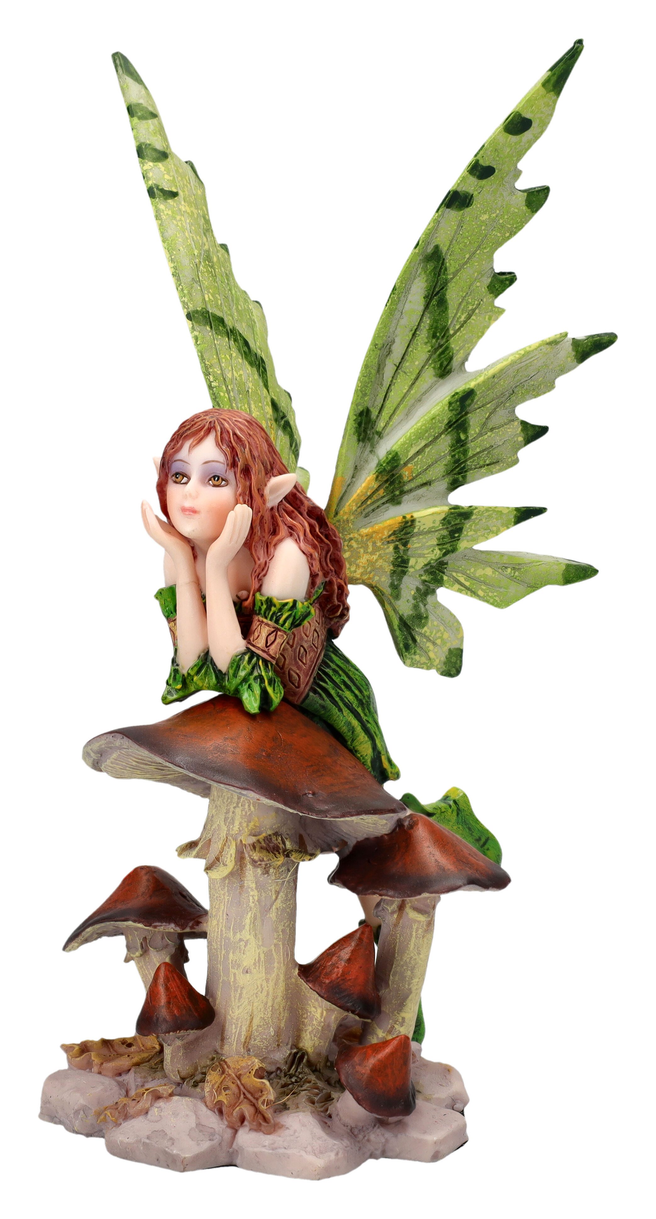 Die bezaubernde Elfen Figur Misela lädt mit ihrem verträumten Blick zum Träumen ein. Mit rötlichen Haaren, grünem Kleid und filigranen Flügeln wurde sie liebevoll von Hand bemalt. Die 17 cm hohe Statue aus Polyresin ist detailreich gestaltet und wird zum Blickfang auf jeder Blumenbank oder im Regal. Perfekt für Sammler und als Geschenkidee für Fantasy- und Elfenliebhaber. Die Flügel sind zum Stecken.